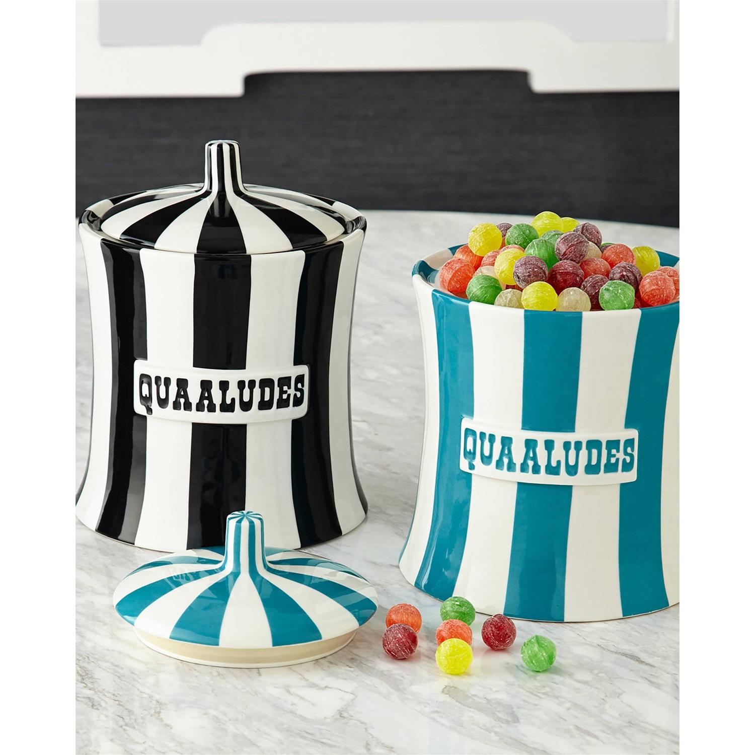Jonathan Adler Vice Quaaludes Canister Canister Hand-painted high-fired porcelain finished with a gloss glaze
