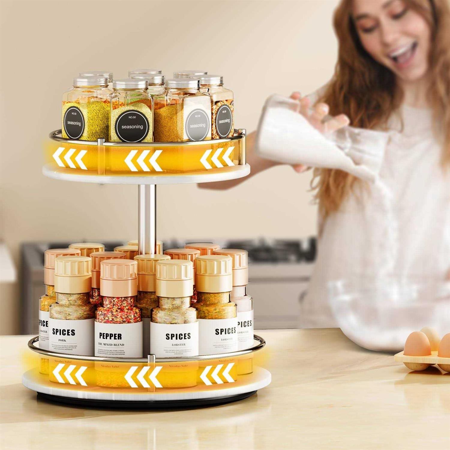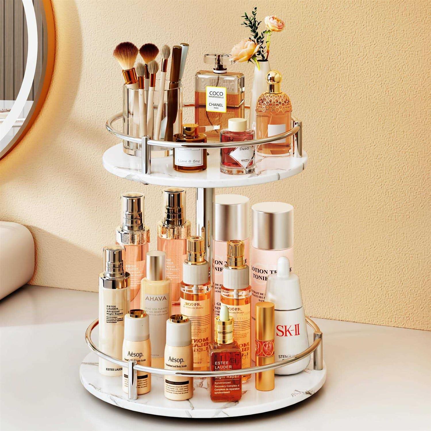 Makeup Skincare Organizer for Vanity Rotating Perfume Cosmetic Display Bathroom Marble Tray 2 Tier Spinning Lazy Susan