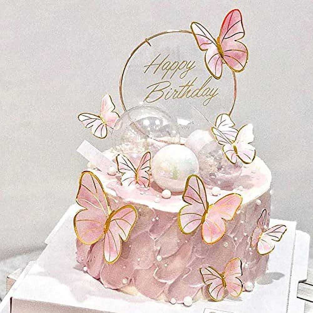 Hazyore Pink Butterfly Cake Toppers 11pcs Butterfly Cupcake Toppers Happy Birthday Metal Gold Cake Topper for Girls Womens Birthday Cake Party Decorations