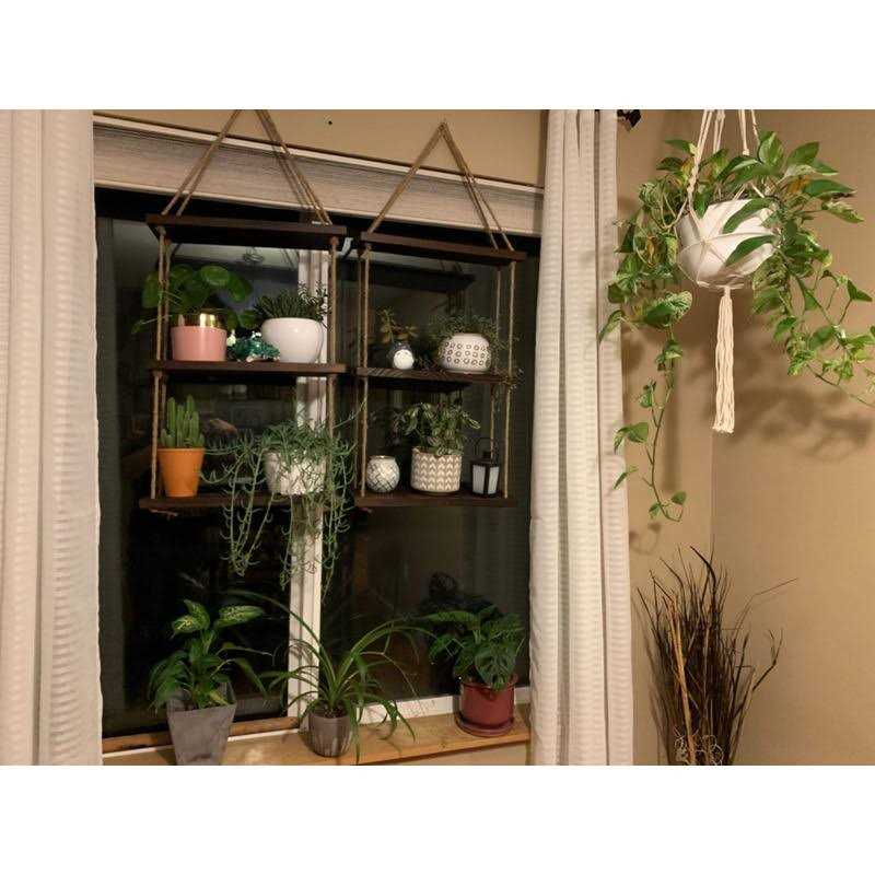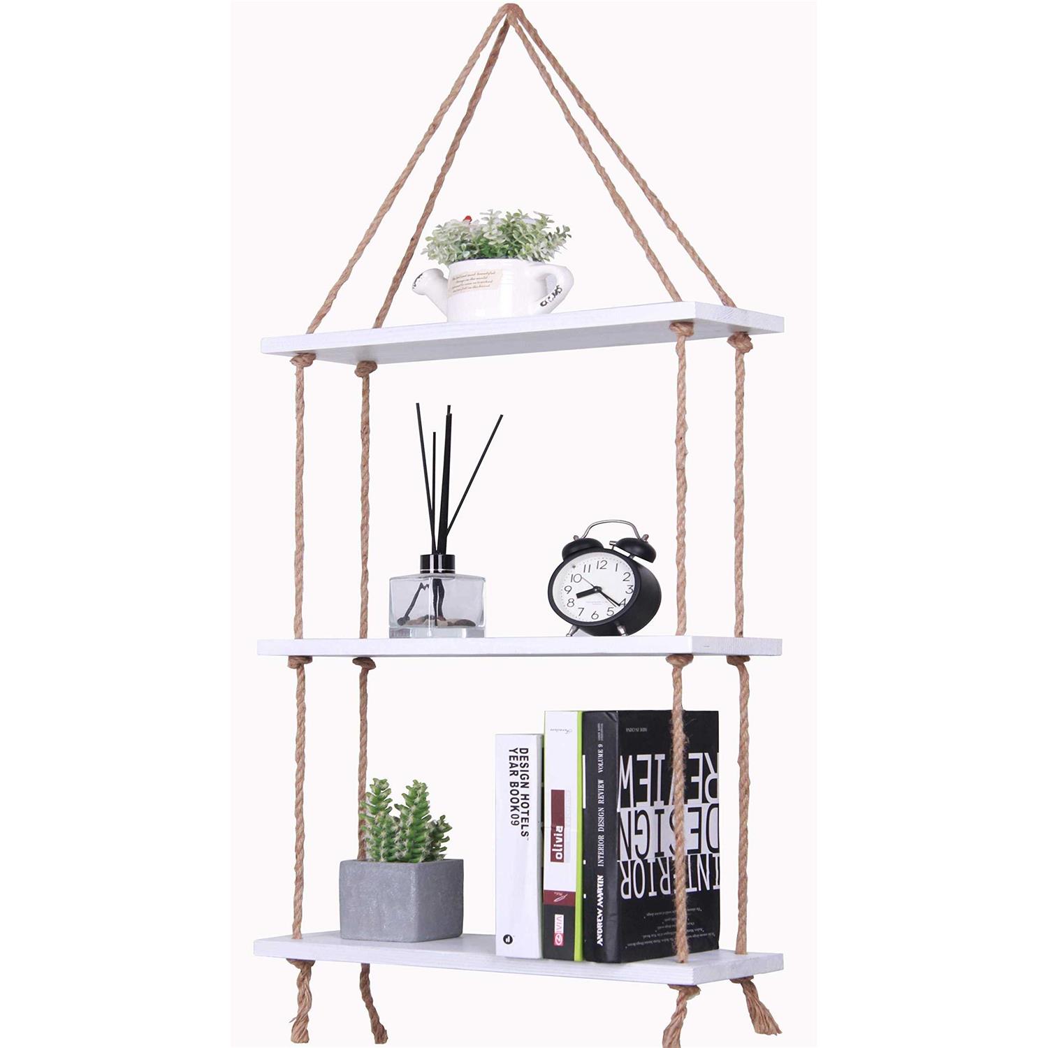 Hxswy Rustic Rope Hanging Shelves for Wall Wood Window Plant Shelf Indoor 3 Tier