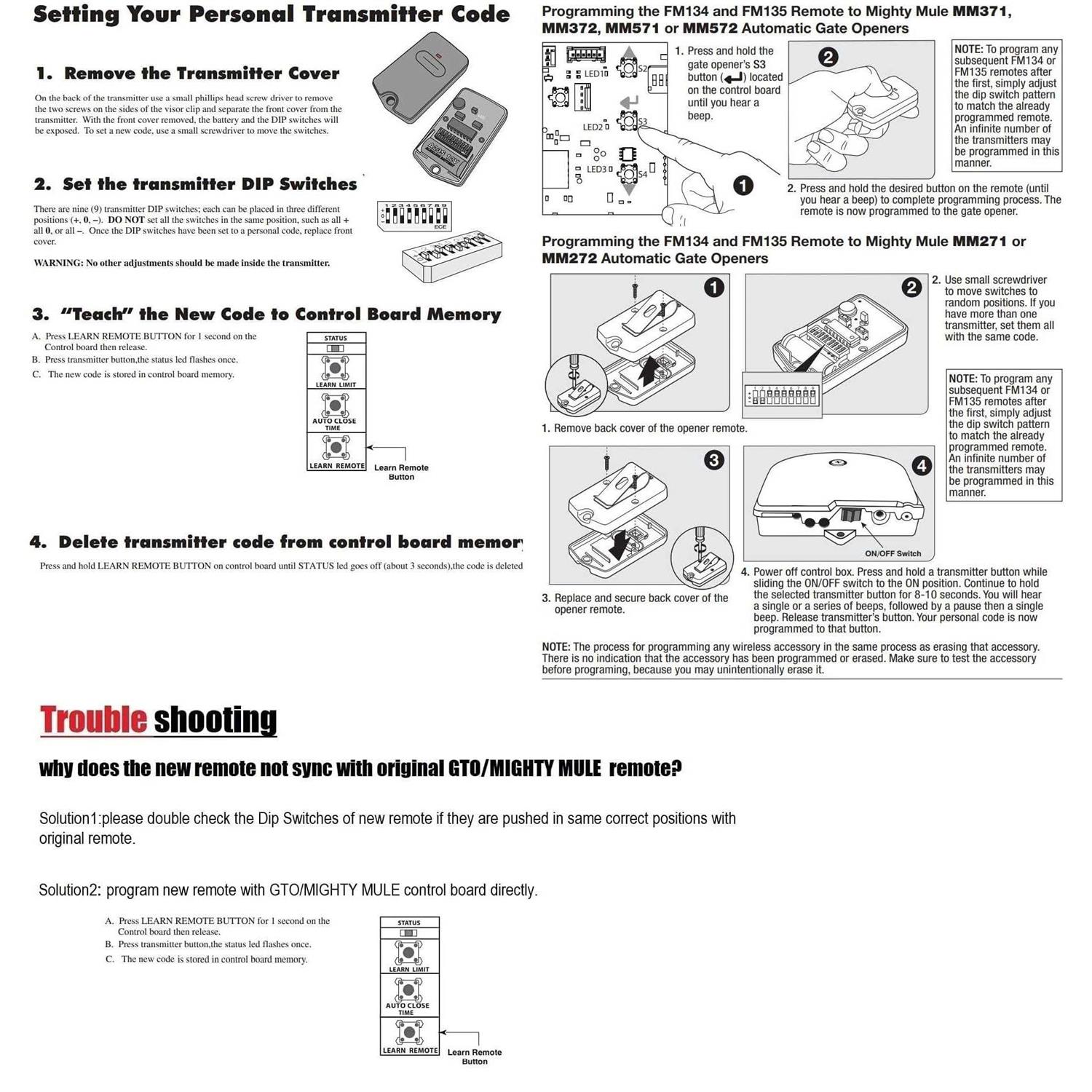 Compatible with All Mighty Mule and GTO / Linear Pro Access Gate Openers. 9 Dip Switches, 3 Positions, Frequency 318MHZ. Battery and Visor Clip,User Manual Included. compatible with all GTO/Mighty Mule/linear single button remote RB741 FM135