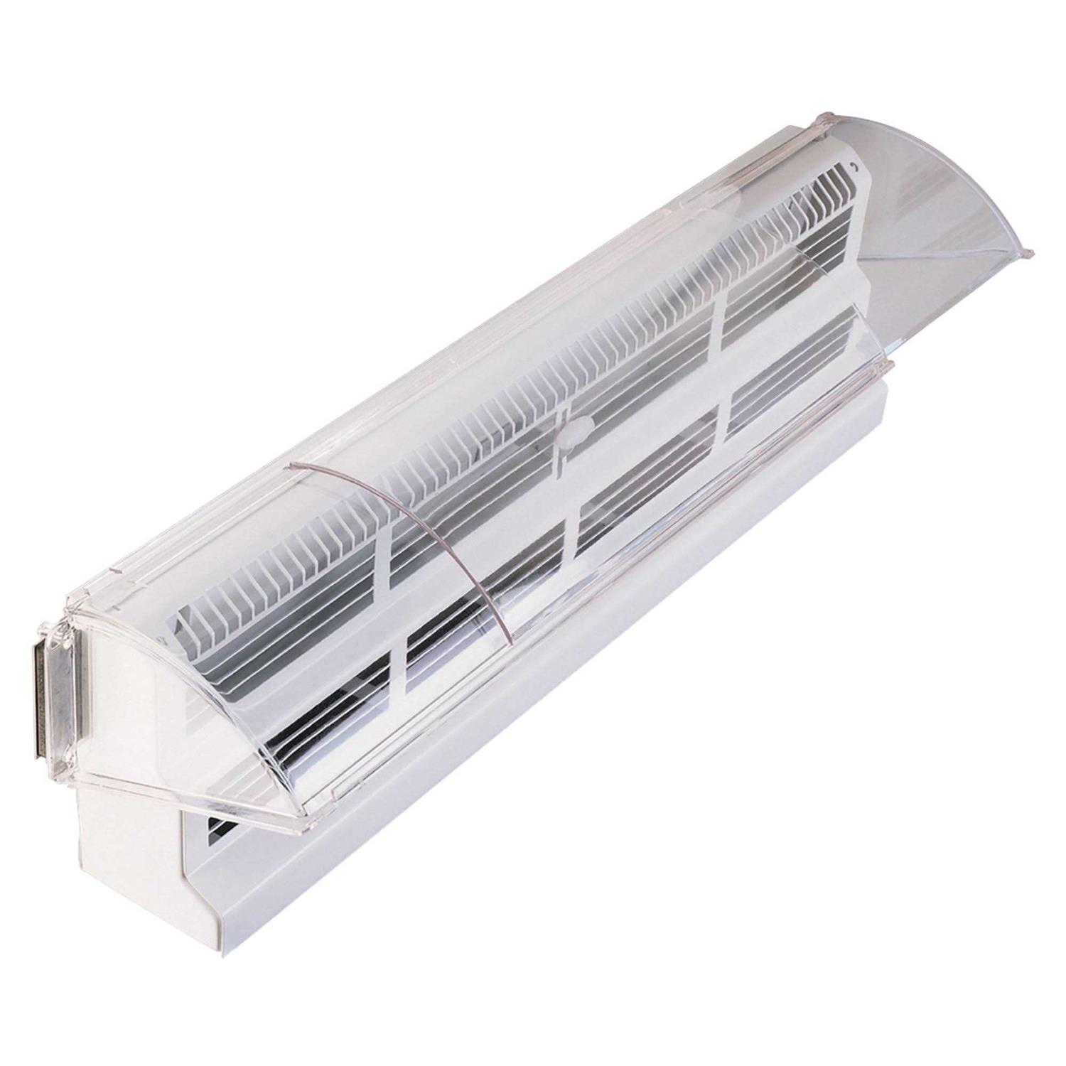 Brand new in original box, Deflecto brand air deflector, model 53, adjustable from 15 to 25 inches. Clear plastic cover is held in place by strong magnets. Saves energy, improves heating and cooling. Deflects heat down, floors stay warmer, conserves heat. Simply invert deflector for more effective air conditioning.