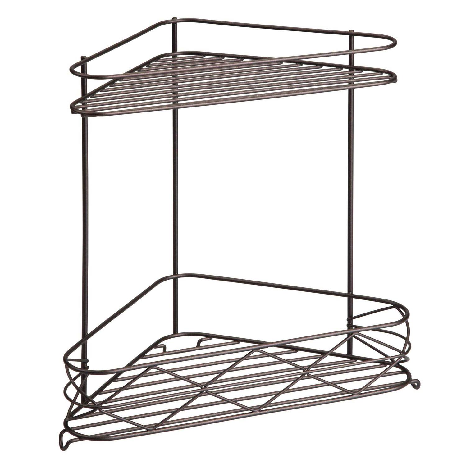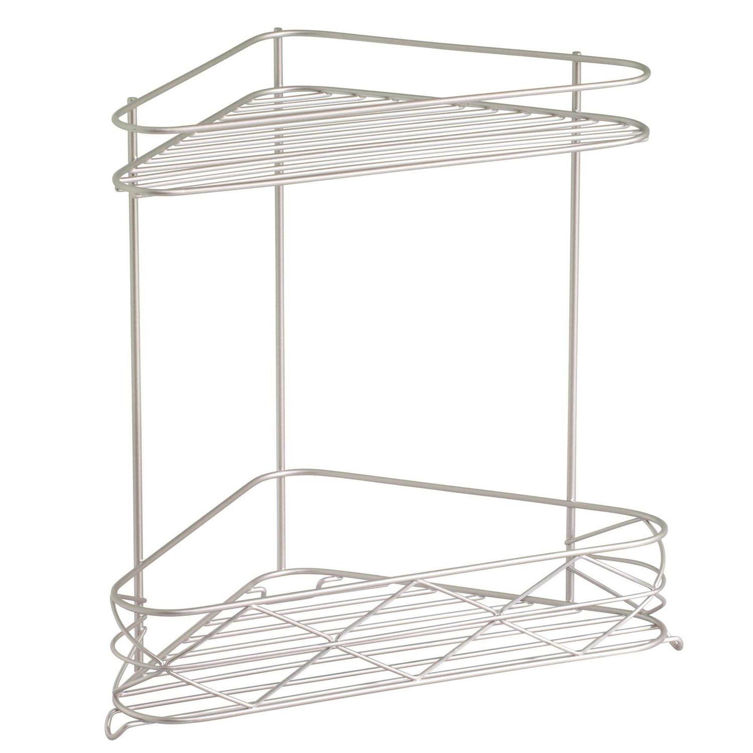Organize your shower in style with the Better Homes & Gardens Corner Storage Shelf. This organizer provides two tiers of storage space for a variety of bathroom necessities such as shampoo and conditioner bottles, body wash, soap, toothbrushes, toothpaste, razors, makeup, cosmetics, towels, and more. The open wire design provides proper airflow to allow wet items to dry more efficiently after use, making it ideal for use in the shower or bathtub. This versatile, free-standing storage shelf does not require mounting and can also be used on bathroom vanity countertops or under the sink, as well as in the kitchen, pantry, office, closet, laundry room, or any room in the house that you need additional organization. The durable steel construction with rust-resistant coating and satin silver finish stands up to every day use and matches a variety of decor styles. Measuring 10.4 inch x 6.3 inch x 10.5 inch, this 2-tiered shelf maximizes corner storage space.