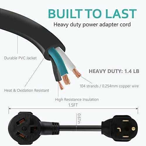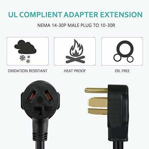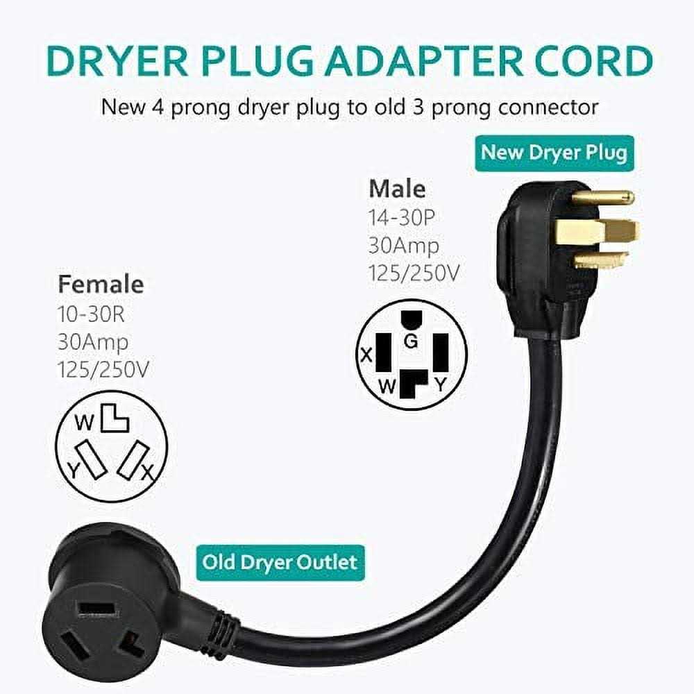 If you happen to have an older dryer with a three-prong cord, you will need to replace its cord with a four-prong cord to match your new four-slot outlet. If you have very good skills as a DIY electrician, you can also consider wiring a new outlet yourself, but you need good skills and an understanding of electrical systems. For most people, it is better to get certified electrician to get the dryer rewired or purchase an adapter like this to easily solve the problem. SPECIFICATIONS : Male Plug: 14-30P Female Connector: 10-30R Amperage: 30A Voltage: 125/250V Pins: Both Right Angle for 14-30P and 10-30R Wire Gauge: 10/3 AWG Length: 1.5FT (18inch) Color: Black INSPECTIONS CARRIED BEFORE LEAVE FACTORY: 1. Structure and Measurement: measure with Vernier calipers 2. Quality of Appearance Check: surface should be smooth and no burr and rust 3. Endure Voltage Testing: using integration testing equipment 4. Cable and Connection: using integration testing equipment 5. Electrify & Short Circuit Testing: using integration testing equipment