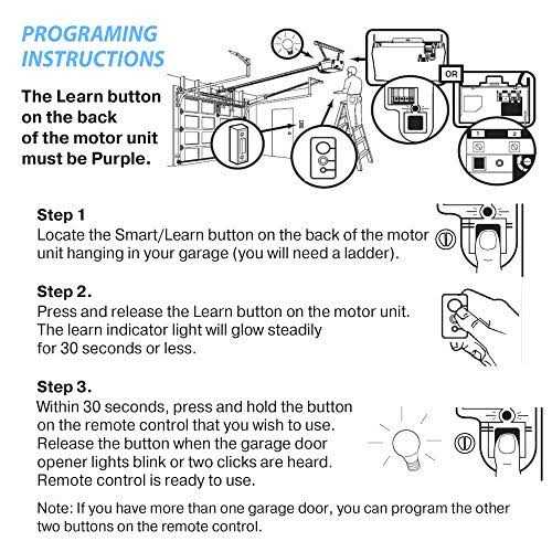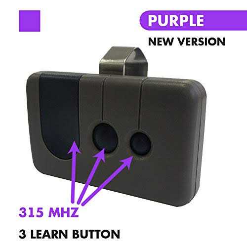 Garage door opener works with frequency 315MHz. One remote control included 3 Buttons Visor garage door opener remote control can works for PURPLE learn button Universal garage door remote compatible with: Craftsman garage door opener remote: 139.18191, 139.18192, 139.53752, 139.53753, 139.53754; Liftmaster remote garage door opener: 355LM, 365LM, 370LM, 371LM, 371LMC, 372LM, 372LMC, 373LM, 373LMC, 373P, 373W, 374LM, 374LMC, 376LM, 377LM, 377LMC, 378LM, 398LM and 41A6127-1; Chamberlain garage door opener remote: 950D, 950CD, 953D, 953CD, 956D, 956CD, 41A6318, 940D, 940CD Please make sure your garage door opener has PURPLE learn button, or this will not work! The Learn button is located on your garage door opener. Universal garage door remote easy to follow programming instructions in package. Our gate opener remote is the best solution! Premium qualit