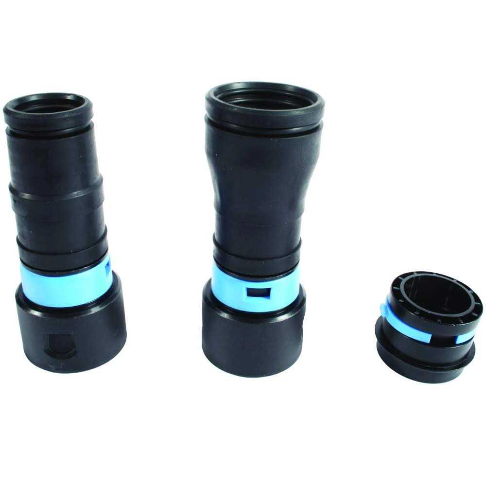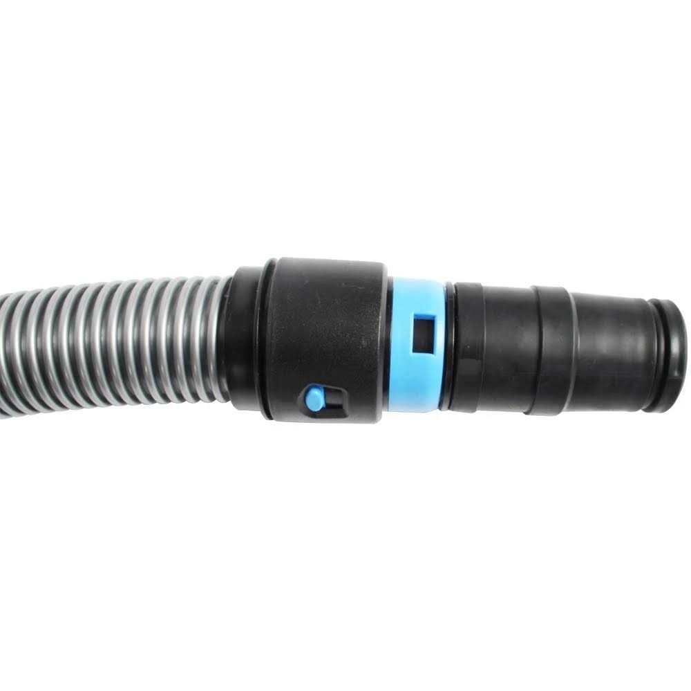 Airflow to the tool can be modified as necessary for suction control using a swivel air relief feature built into bayonet fitting Comes with quick click system for connecting to the exhaust port on all major brands of hand held and stationary power tools. A collar with clip ring, a bayonet fitting with a 1 soft TPE fitting, and a second bayonet with a soft 1. 50 TPE fitting are designed to accept and hold exhaust ports designed to fit the hose internally or externally as demanded by the power tools design. Changing from one end fitting to the other takes a few seconds and offers a smooth 360 degree swivel connection to prevent the hose from kinking or restricting movement of the power tool The soft molded TPE fitting measures 1 on the inner diameter and has four concentric rings to hold firmly to the power tool. For power tools with a female connection the 1 soft TPE part measures 1. 40 on the outer diameter. The soft rubber like feel and taper of the fitting insures a positive tool forming fit Includes a second bayonet with a soft molded TPE fitting that measures 1. 50 on the inner diameter with three concentric rings to hold firmly to the power tool even when carrying a substantial flow of debris in the air stream. The fitting measure 1. 90 on the outer diameter. The soft TPE allows the fitting to form to the shape of the exhaust port off of the selected power tool The inner collar and acetal clip ring are designed to fit to tools directly that accept a quick click collar connection. The collar connector is 1. 75 on the outer diameter with the acetal clip designed to snap into place on power tools fitted for this feature Designed to fit most major brands of power tools and work shrouds including Skill Bosch, Ryobi, Makita, Dewalt, Festool.
