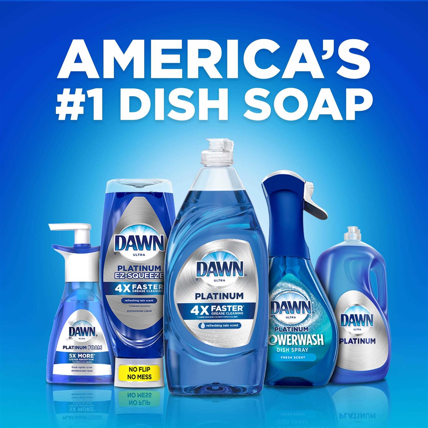 Your toughest everyday messes are no match for Dawn Platinum dishwashing liquid dish soap. with 4 x Faster Grease Cleaning Power (based on cleaning ingredients per drop verses. Dawn Non-Concentrated). Dawn Platinum is our best dish detergent. Dawn Platinum’s improved formula easily removes 99% of grease and food residues by breaking the bonds that hold grease together, on contact. Dawn dishwashing liquid dish soap can even be used to clean items beyond the kitchen sink. Use Dawn dishwashing liquid to remove grease and grime from external car surfaces and the outer shroud of a gas grill. Dawn dishwashing liquid dish soap #1 Dish Liquid (based on sales). Refreshing rain scent America’s #1 dish liquid (based on sales) Contains 4 x faster grease cleaning power (cleaning ingredients per drop verses Dawn non-concentrated) Dawn platinum dishwashing liquid can even be used to clean items beyond the kitchen sink, use Dawn dishwashing liquid to remove grease and grime from external car surfaces and the outer shroud of a gas grill Dawn platinum’s improved formula easily removes 99% of grease and food residues by breaking the bonds that hold grease together, on contact null Your toughest everyday messes are no match for Dawn Platinum dishwashing liquid dish soap. with 4 x Faster Grease Cleaning Power (based on cleaning ingredients per drop verses. Dawn Non-Concentrated).