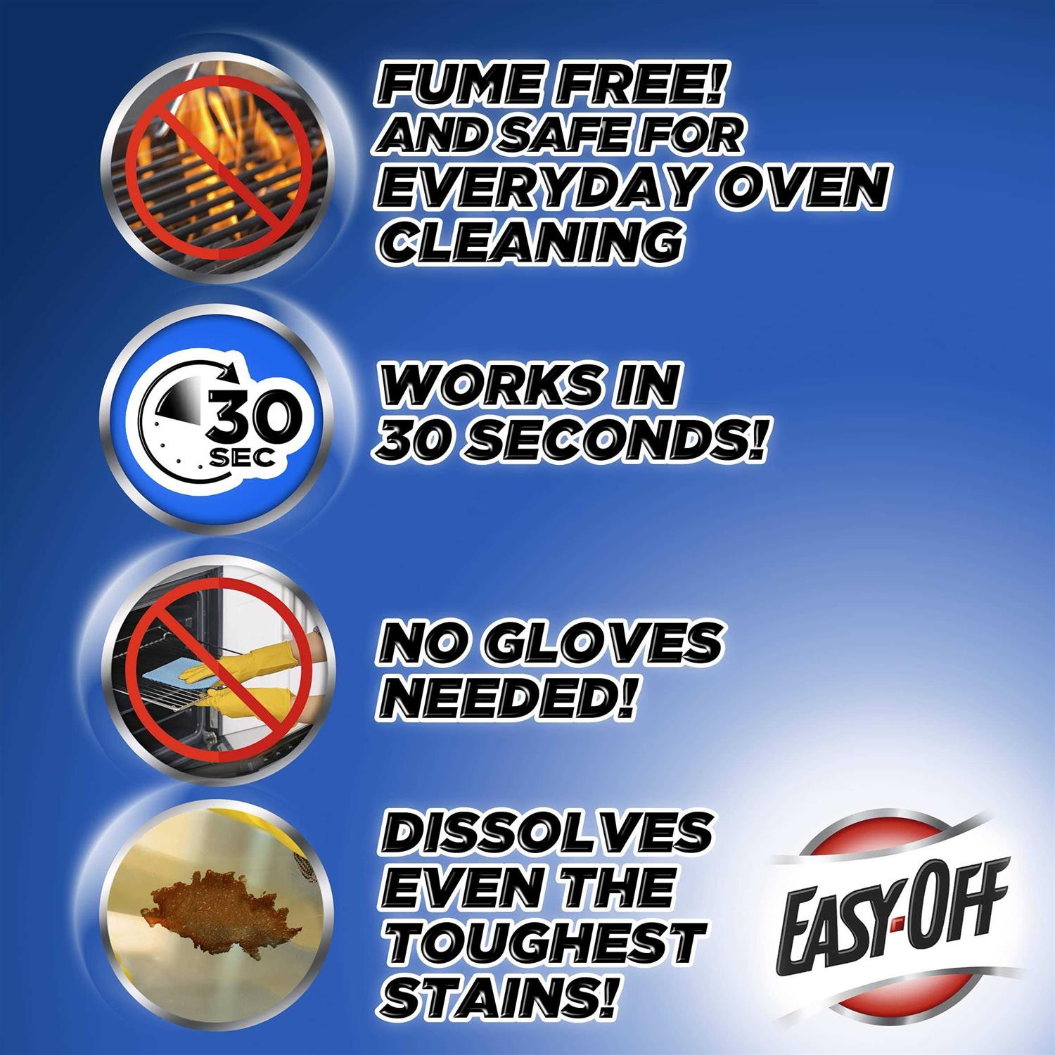 Cleans tough baked-on ovens grease & spills with no fumes Safe for self-cleaning ovens, just spray on the stain and wipe away Use to clean ovens, oven doors, broilers, broiler pans, and stainless steel surfaces Product of Easy-Off EASY-OFF Fume Free Oven Cleaner cleans tough baked-on ovens grease & spills with no fumes. Tough spills are removed in seconds! It’s perfect for spot-cleaning and everyday use. Safe for self-cleaning ovens, just spray on the stain and wipe away! No gloves required! Use to clean ovens, oven doors, broilers, broiler pans, and stainless steel surfaces. Cook with passion. Clean with Easy-off!