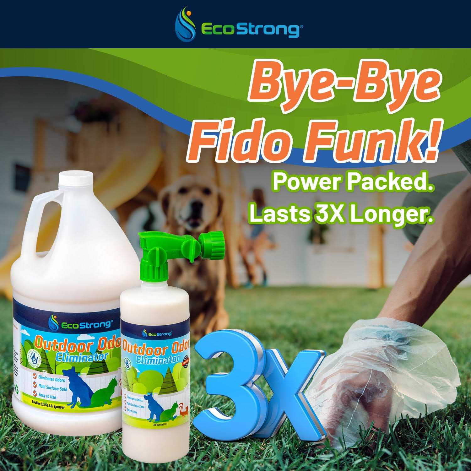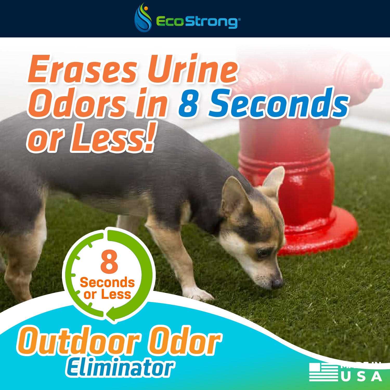 EcoStrong’s Outdoor Odor Eliminator is an all-natural solution that eliminates unpleasant outdoor odors. Permanently erase urine, stool, vomit, skunk, or even garbage odors from your outdoor spaces. Safe for use on virtually all outdoor surfaces; rock, dirt, grass, fences, furniture, concrete, wooden decks, and more.