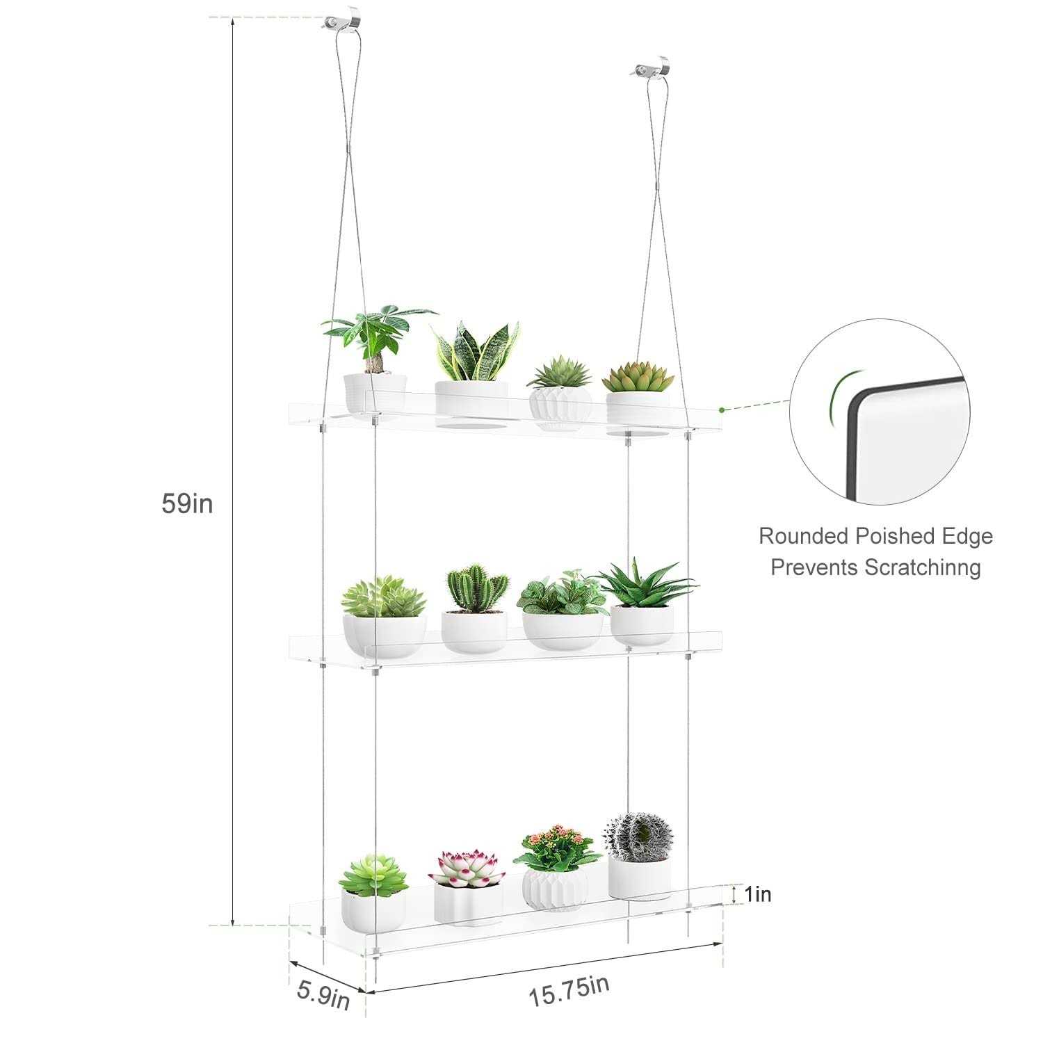 HIGH QUALITY & MODERN DECOR DESIGN – Clear shelves, made of non-yellowing high quality 3.0mm acrylic modern transparent design, bring you with a touch of refreshing contemporary sense and help to keep the original color of your plants. Transparent plant wall shelves appear to take up little or no visual space. SUPER CLEAR ACRYLIC SHELVES – The 3-tier hanging shelves are perfectly crystal clear AFTER the protective film is removed, and it does not restrict light shining in on a room either. Very clean looking and looks like a greenhouse window. It still allows you to easily see outside while doing dishes and cleaning up the kitchen. ADJUST HEIGHT FREELY – Size:16”Long, 6″ Wide, 1″ Deep. Layer Cable is 59”. The hanging window shelves could hold about 3-5 small flower pots each tier nicely. You can easily adjust the spacing by pressing the locking turnbuckles to obtain the best fit for windows and plant growth. EASY TO ASSEMBLE – All the parts, step-by-step instructions and hardware were included, please assemble according to the manual. All of the acrylic pieces are protected with a layer of protective film( avoid scratching during transportation). Please remember to peel the protective film off before use. MULTIPLE PLACES FITTING – The acrylic window shelves are perfect for displaying plants,flowers,perfume,crystal in living room,bedroom.They can also used as bathroom storage shelves and kitchen window decor. Our acrylic wall shelf is the ideal housewarming gift for your friends and family. The window plant pots organizer is not only a great shelf to save space and keep plants away from cat but in the sunlight. Also you have a place to grow fresh herbs,veggie,mint,african violet seedlings etc.