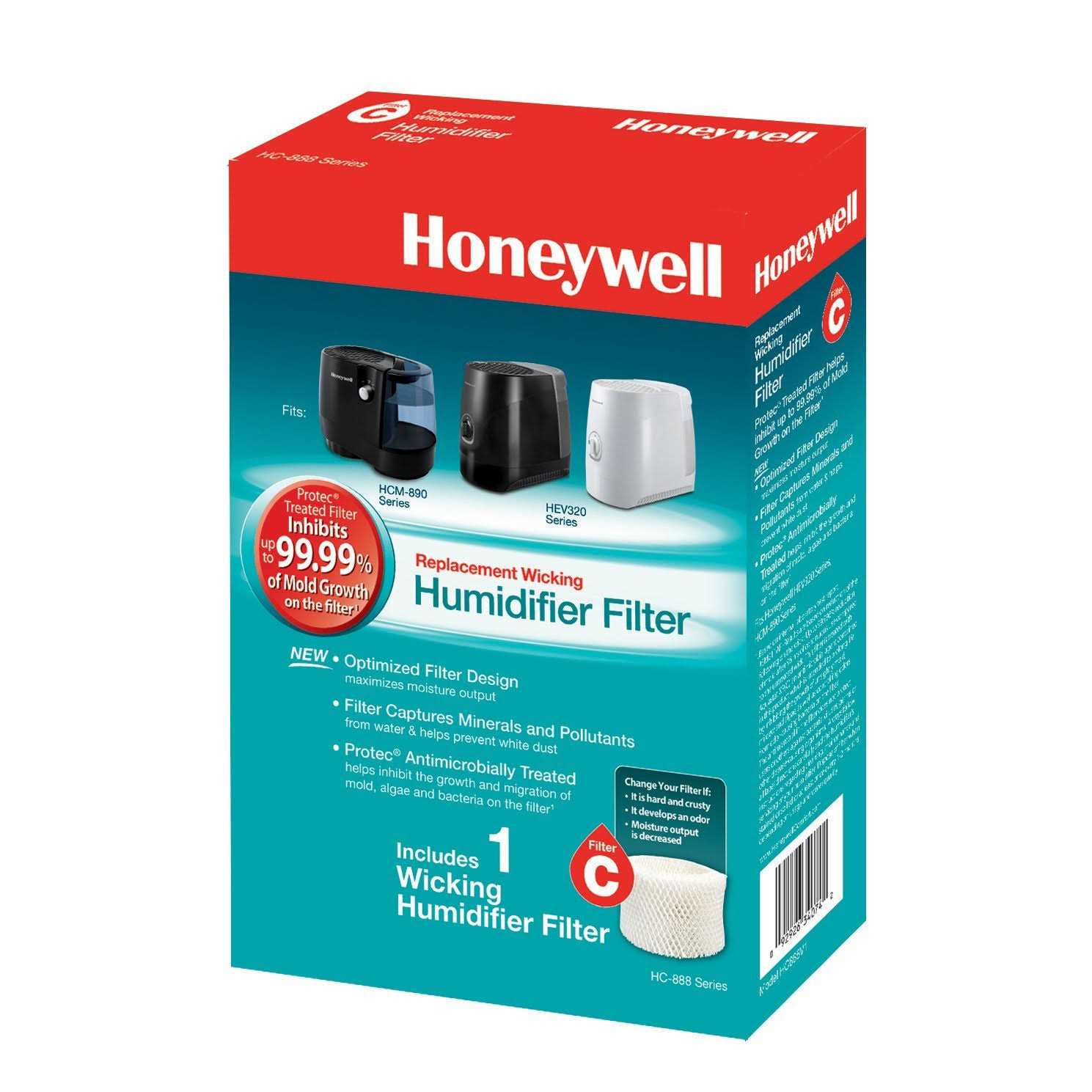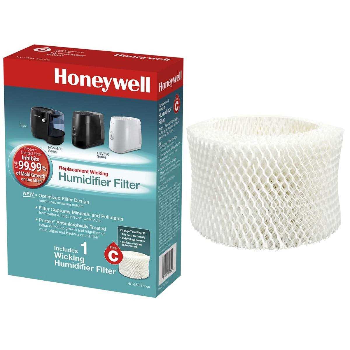 To ensure stated product performance, use only genuine Honeywell Replacement Wicking Filter model HC-888. It is treated with Protec antimicrobial to inhibit up to 99.99% of mold growth on the filter. Filter captures minerals and pollutants from water & helps prevent white dust Optimized Filter Design maximizes moisture output Fits Honeywell Model: HCM-890 and Duracraft Models: DCM-200, DH-890, DH-888. Use with cool moisture evaporative humidifiers This replacement filter for Honeywell natural cool moisture humidifiers removes minerals and pollutants from water. Protec Antimicrobial Treatment helps prevent the growth and migration of mold, fungus, algae and bacteria on the filter. The filter material is reinforced for maximum efficiency and longer filter life. Plus, the exclusive Dry Lift Handle helps to keep hands dry and clean while changing your filter.