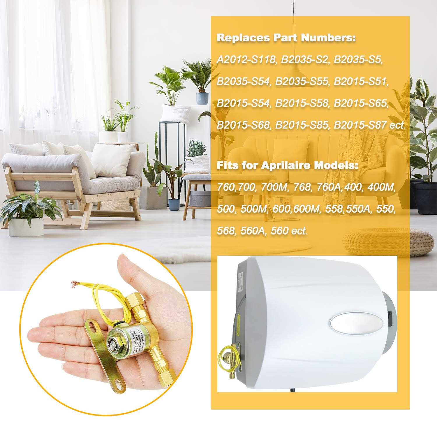 Humidifier Water Solenoid Valve 4040 for Aprilaire Whole House Humidifier 400 400M 500 500M 600 600M 558 550A 550 568 560A 700M 768 760A 760| 24 Volts | 2.3 Watts | 60 HZ-Yellow Product Features Humidifier Solenoid Valve 4040 Package includes:4040 humidifier solenoid valve for Apri.laire,YELLOW.4040 humidifier solenoid valve controls the amount of water entering your for Aprilaire whole house humidifier, which can help you maintain an optimal humidity of 35% 45%, thereby reducing the occurrence of respiratory infections and symptoms related to asthma.( 24 Volts | 2.3 Watts | 60 HZ-10006735.) FITS MODELSOur humidifier water solenoid valve compatible with April.aire models 110, 112, 220, 224, 350, 360, 440, 550, 550A, 550-A, 558, 560, 560A, 560-A, 568, 600, 700, 760, 760A, 760-A, and 768. Replaces Part:A2012-S118, B2035-S2, B2035-S5, B2035-S54, B2035-S55, B2015-S51, B2015-S54, B2015-S58, B2015-S65, B2015-S68, B2015-S85, B2015-S87 10006735 ect DURABLE MATERIAOur A2012-S118 HUMIDIFIER SOLENOID VALVE is made of solid brass material, durable and sturdy, well-tested by the manufacturer.Non original aftermarket part. Fits OEM Standards! It fixed the issue with the old valve not shutting off and allowing water to run continuously EASY TO INSTALLThis humidifier solenoid valve 4040 is easy to install,You only need a screwdriver and wrench to perform repairs