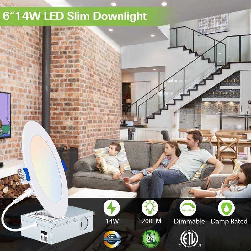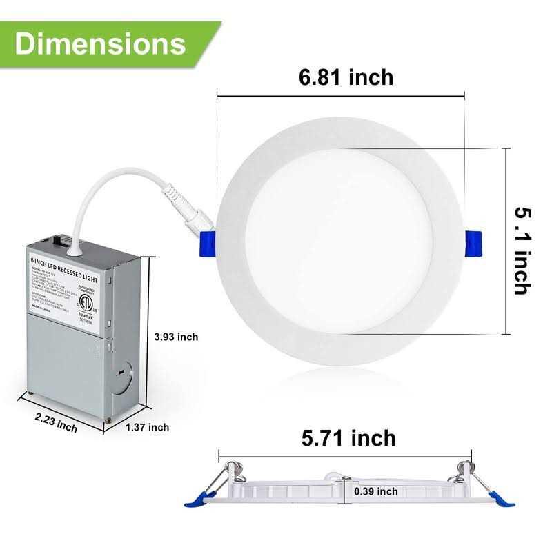 5 CCT – Our led recessed lights offers you the option of choosing your color temperature directly on the fixture. With the flick of a switch, you can choose between 5 color temperatures ranging from warm (2700K) to daylight (5000K) before install into your ceiling. High Brightness – The 6 inch led puncake lighting use the world’s leading LED chips with higher lumens and lower power. 1200LM consumes 14 Watts, which equals to 120W halogen lamp, saving you up to 90% in energy costs. Easy To Install – Cut a 6.2″ hole in ceiling and use spring clips firmly secure recessed LED lights for retrofit and new decoration. No Housing or J-box Needed. Damp Location Rated is ideal for use at kitchen, living room, bedroom, bathroom, workplace, outside soffits, office etc. High Quality – IC Rated for direct contact with ceiling insulation, meaning the junction box is thermally protected. Our led ceiling lights are certified by ETL & Energy Star for better quality, safety and reliability. It’s high quality driver allows the light to dim without any unwanted flickering, flashing or humming noise. Designed for continuous dimming down to 10%.