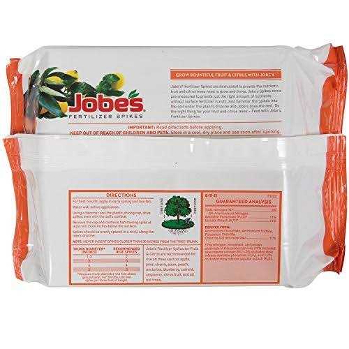 Jobe†s Fruit & Citrus Fertilizer Spikes are specially formulated for fruit, citrus and nut trees. It†s no secret that beautiful, healthy trees make your yard look spectacular. Use Jobe†s Fertilizer Spikes for Fruit & Citrus Trees to ensure a continuous supply of nutrients below the surface, where the trees†active roots are growing. Jobe†s spikes are easy to insert and are applied around a tree†s dripline. No wasteful runoff, no mess, hazards or smells – only a safe beautiful yard. For best results, use Jobe†s Fertilizer Spikes for Fruit & Citrus Trees in early spring and late fall. Jobe†s Fruit & Citrus Fertilizer Spikes will help your fruit and citrus trees thrive.