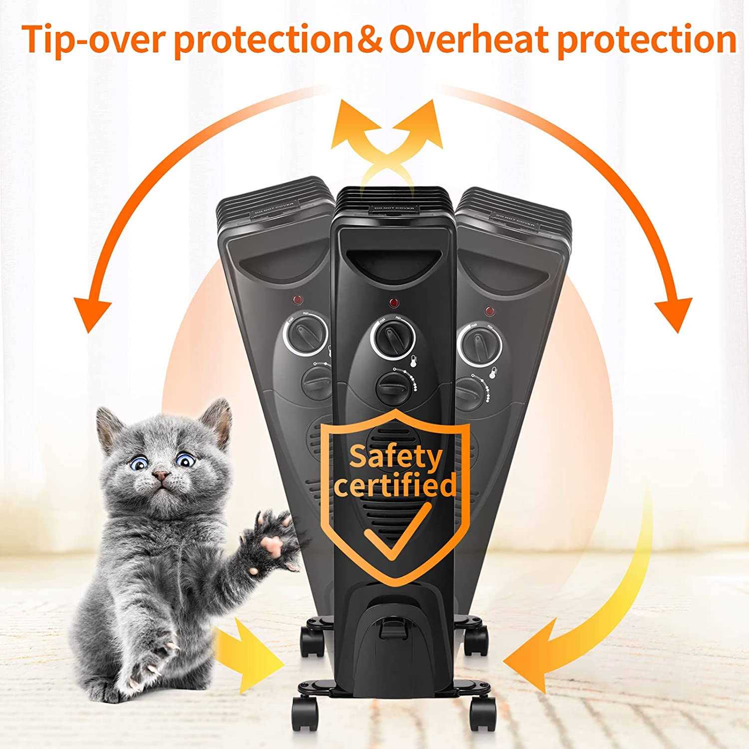 Kismile 1500W Oil Filled Radiator Heater, Portable Electric Heater with 3 Heat Settings, Adjustable Thermostat, Overheat & Tip-Over Protection, Oil