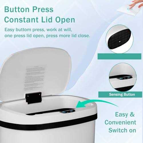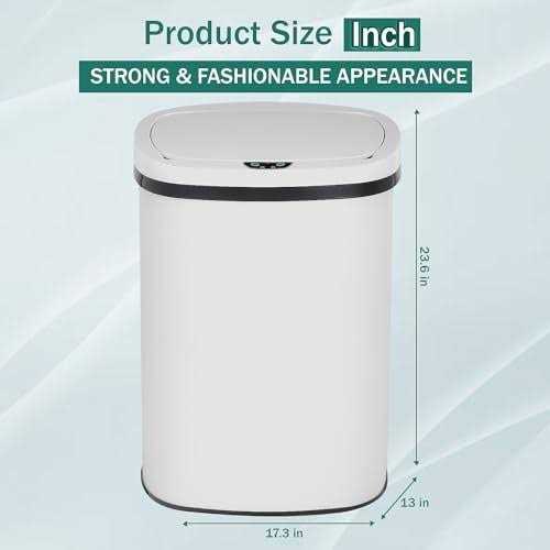 Touch-Free Operation: Our kitchen trash can is equipped with an advanced motion sensor that opens the lid automatically when it detects movement within 6 inches. This automatic trash can’s touch-free operation ensures a hygienic and convenient disposal experience.This trash can reduce the risk of germ transmission. High-Capacity Convenience: Our kitchen trash can with a generous 50-liter 13 Gallon capacity. This automatic trash can is perfect for high-traffic areas like the kitchen, bathroom, bedroom, or home office. Say goodbye to frequent emptying and hello to a more efficient waste management solution with our trash can. Sleek Brushed Stainless Steel: This kitchen trash can crafted from premium brushed stainless steel. this automatic trash can doesn’t just handle waste; it complements your decor. The elegant finish of trash can adds a touch of modern sophistication to any room while ensuring durability and easy cleaning. Lid That Seals in Odors: Our kitchen trash can comes with a secure-fitting lid . The automatic trash can is not only keeps odors contained but also prevents curious pets from rummaging through your garbage. Enjoy a fresher, more pleasant-smelling environment with our trash can. Battery-Saving Design: This kitchen trash can’s thanks to the efficient power management system.The motion sensor of automatic trash can operates on a single set of batteries for an extended period. This trash can means fewer battery changes and less hassle for you. Upgrade your waste management game with our touch-free stainless steel kitchen trash can. This automatic trash can combines form and function to provide a convenient, hygienic, and stylish solution for handling waste in your bathroom, bedroom, home office, or any space where cleanliness and efficiency are paramount. Say goodbye to ordinary trash cans and embrace the future of waste disposal with our trash can. br br Specification: /b br br Product Dimension: 16.0”L x 11.4”W x 22.8”H br br Color: White br br Item Weight: 8 Pounds br br Capacity: 52.8 Quarts br br
