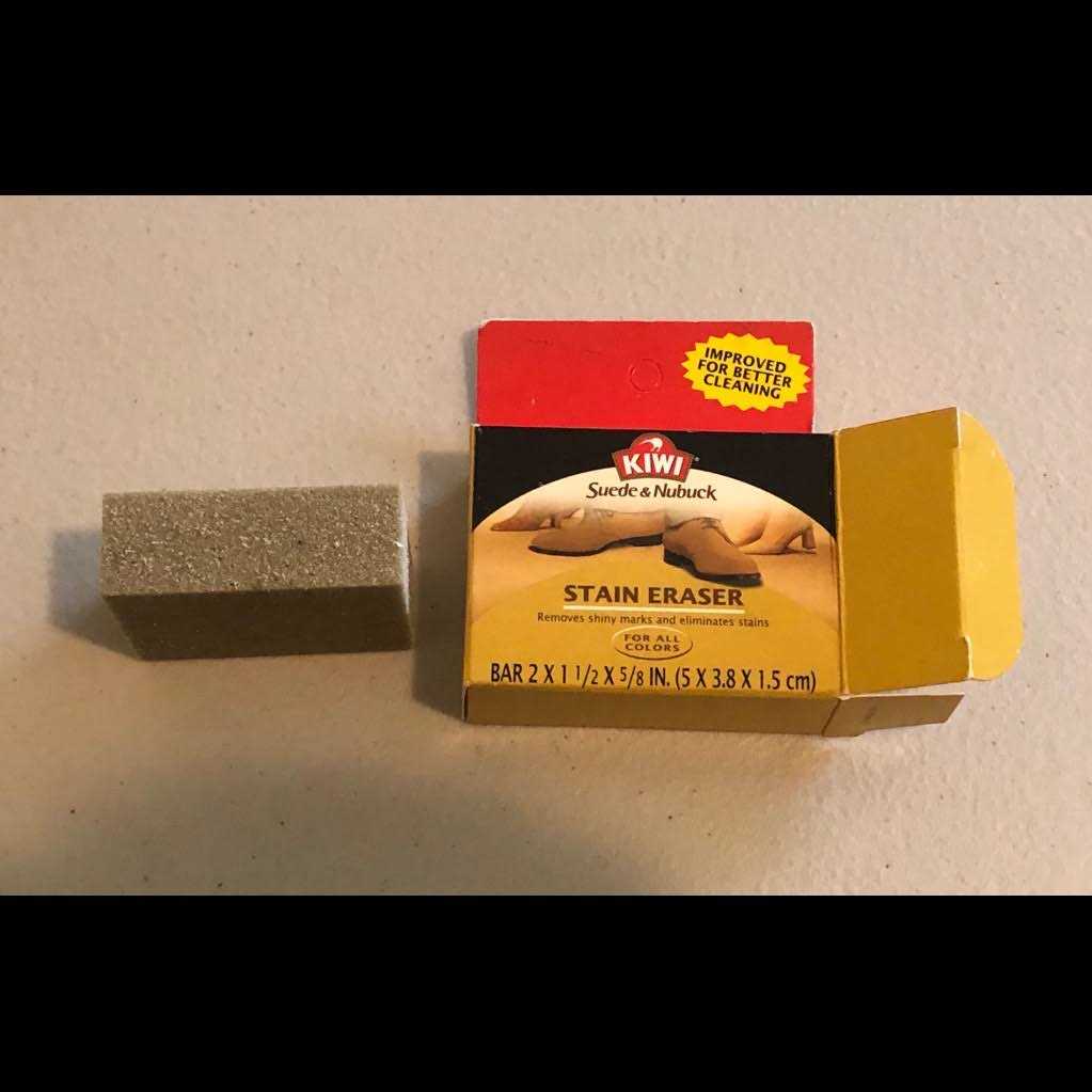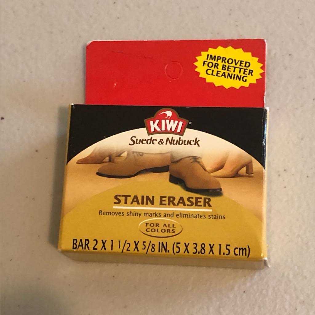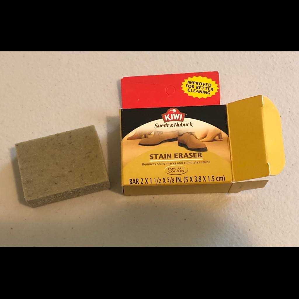 Kiwi Suede & Nubuck Stain Eraser is for all colors. Removes shiny marks and eliminates stains. Gently rub one of the coarse sides of the eraser back and forth over the spot or area to be clean. Use suede brush to remove residue and bring up the nap and the original color.