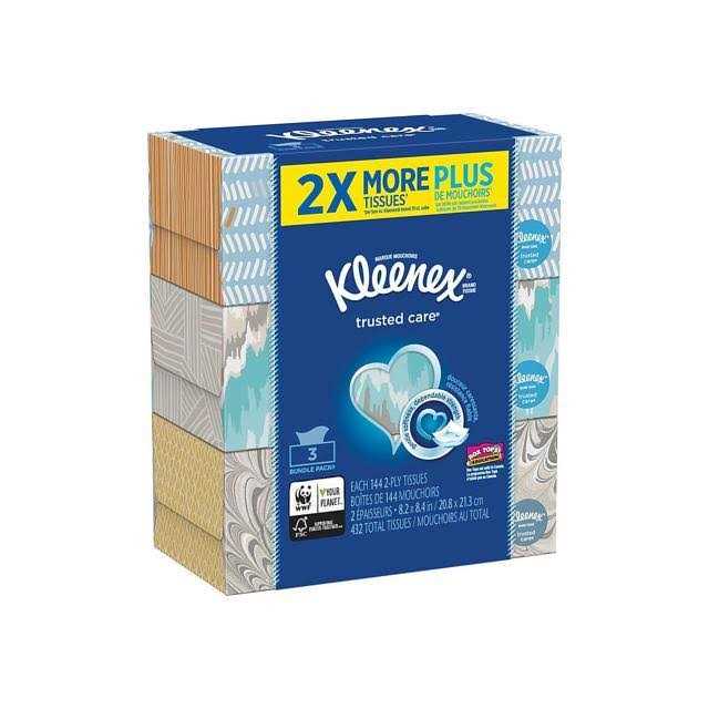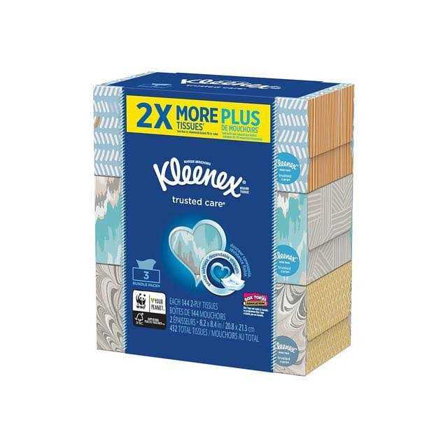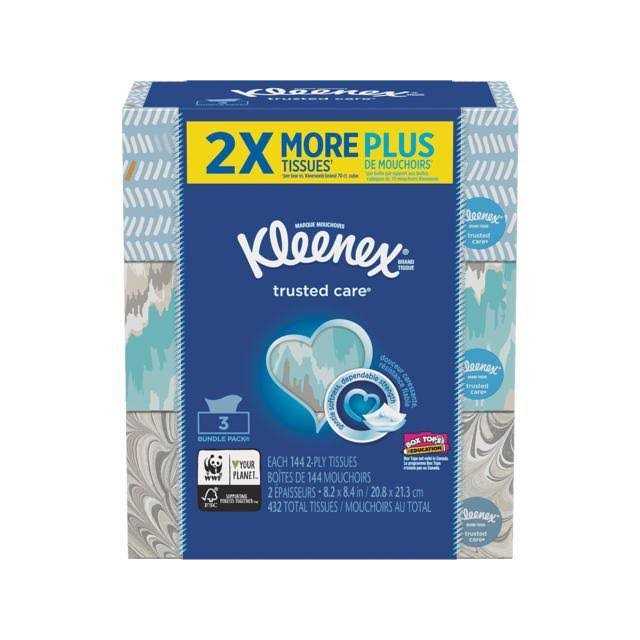 Soft, strong and absorbent Special feature lets you know when tissues are about to run out This product is made from wood that came from a certified managed forest. One soft tissue is all it takes to show you care. Reach for gentle Kleenex Trusted Care Tissues for a friend, a stranger or yourself. Durable 2-ply tissues have a combination of softness, strength and absorbency that locks in moisture. Our essential Kleenex facial tissues are perfect for makeup smudges, sniffles and sneezes, children‚s messy faces and more. Just use and toss. Buy tissues in bulk and save while keeping tissues on hand for family, company and yourself during cold and flu season, allergy season, back-to-school and holidays. And as always, Kleenex Packs come in a variety of colors and designs that blend beautifully into your home d√cor. Place a pack in the living room, kitchen, bathrooms, bedrooms and office. Kleenex disposable facial tissues have been there for happy tears and stuffy noses since 1924.