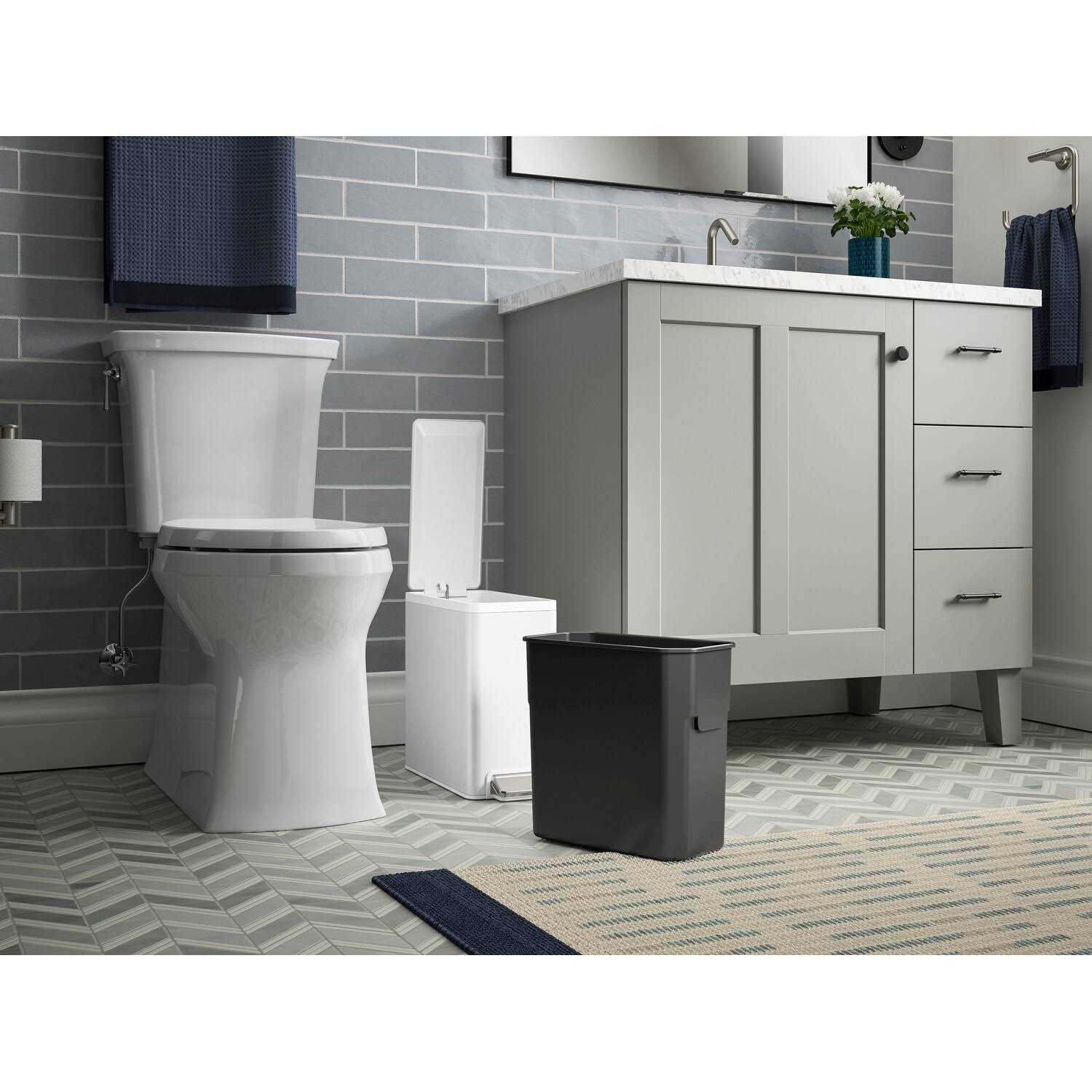 Crafted with thoughtful details and smart functionality, the KOHLER step trash can collection will simplify your daily routine at home and meet the style demands of its surroundings. The 2.5-gallon slim step trash can is ideal for small spaces, such as in a home office or next to a toilet. It opens with a sturdy foot pedal, allowing for hands-free operation. The functional design allows you to use any plastic shopping bag, thanks to tabs that secure the bag in place.