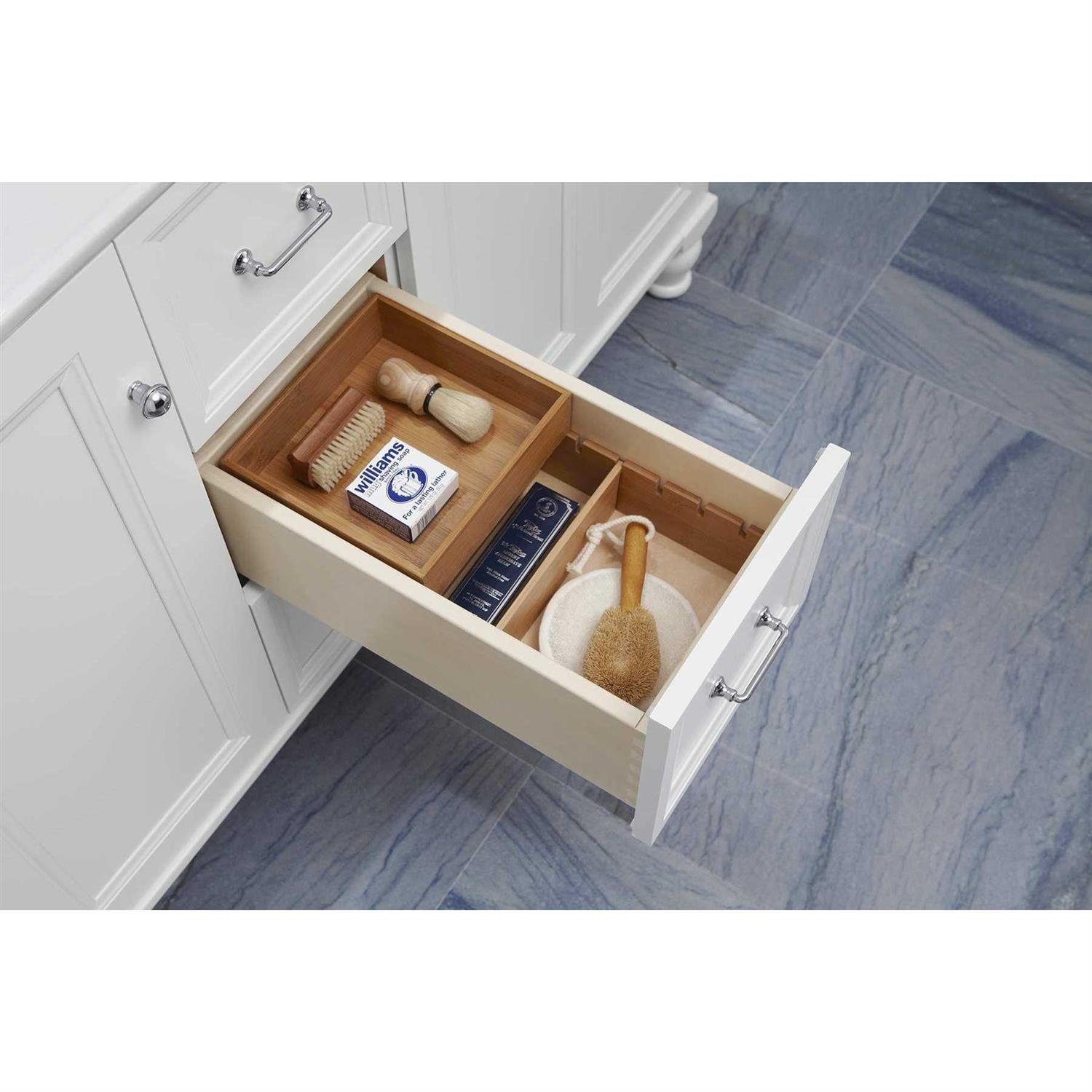 Designed to fit the KOHLER Tailored vanity collection, this drawer divider insert allows you to compartmentalize your vanity drawer for more organized storage. It includes four compartments plus a sliding top tray for two-level storage. For use with Jacquard®, Damask®, Poplin™, Marabou®, and Jute® vanities. Compartmentalizes vanity drawer to maximize storage space and organize items. Four storage compartments. Sliding top tray for two-level storage. Bamboo construction.
