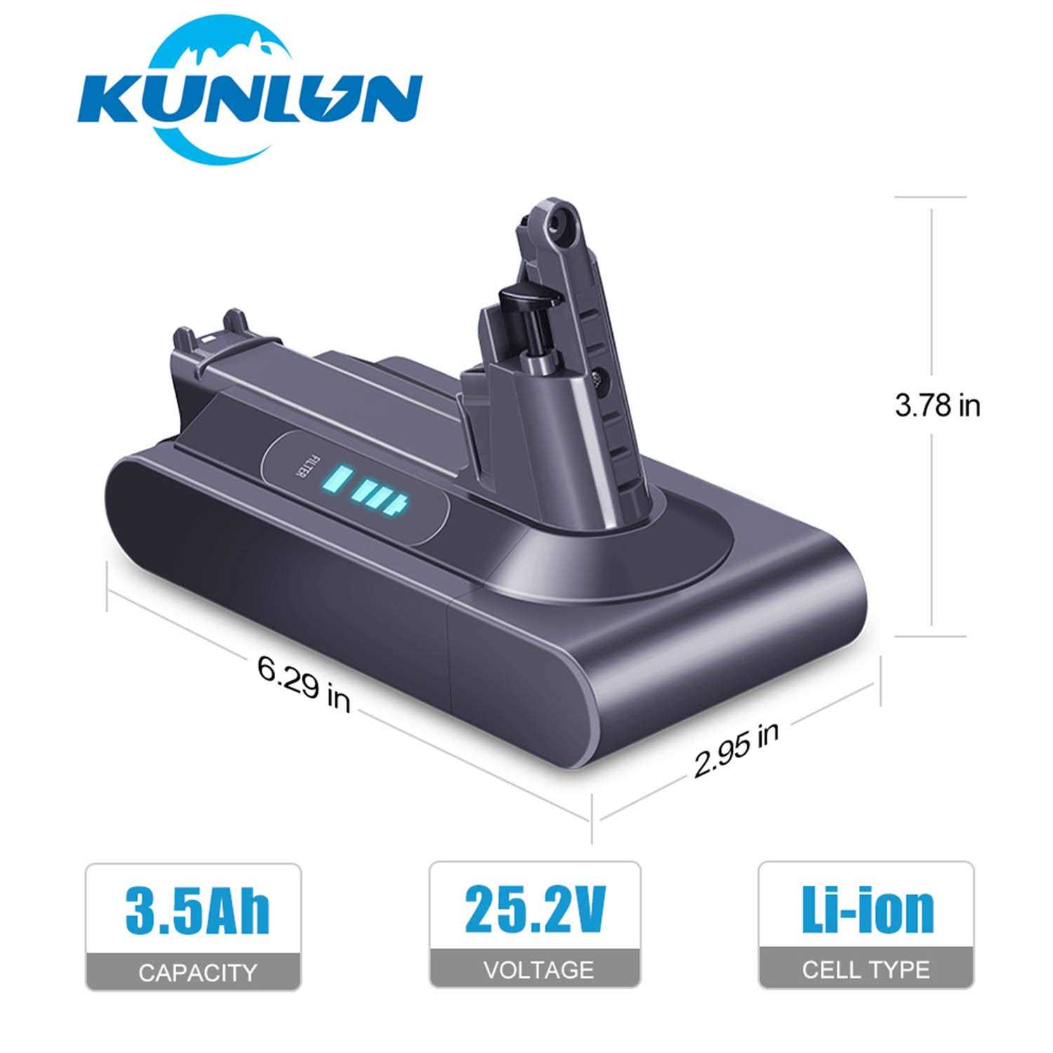 Replacement Battery for V10 Series: Cell Type: Rechargeable Li-ion | Voltage: 25.2V | Capacity: 5000mAh, high capacity for your vacuum cleaner to work longer; Widely Compatibility: The battery is perfectly compatible for Cyclone V10 Animal, V10 Absolute, V10 Motorhead, V10 Fluffy, and the original V10 charger; Charge Quick: 3-hours quick charge, with 3 LED lights on the battery that indicate the remaining power. Normally, charge cycle over at least 300 times; Safety & Reliable: The lithium-ion battery is CE, FCC, ROHS certified, built-in over-charge, over-discharge, over-voltage, over-current, and over-heating protection, safety for the battery and your vacuum cleaner; Bonus Accessories: Package included 1 dust cover, 2 filters, and 1 brush, remove your household dust & dirt, provide clean & fresh air for daily life. KUNLUN Replacement Lithium-ion Battery for V10 Series /b br No memory effect, can be recharged as much as you like, won’t affect the effective life; br Grade A cells ensure fast charges and low power consumption. br br Specification: /b br Battery Capacity: 5000mAh br Voltage: 25.2V br Battery Type: Lithium-ion br Power: 88.2Wh br br Compatible Models: /b br Cyclone V10 Animal br Cyclone V10 Absolute br Cyclone V10 Motorhead br Cyclone V10 Fluffy br Cyclone V10 Total Clean br Fit for Part Number: /b br 206340, 969352-02, SV12 br br Package Included /b br 1 X V10 Replacement Battery br 1 X Dust Cover br 2 X Filters br 1 X Cleaning Brush br br Replace filter tips: /b br 1. Ensure the filter is completely dry and then put it back into the vacuum cleaner. br 3. Let the filter replacement part air dry itself, don’t bake it to avoid deformation. br br Tips: /b br 1. If the red light is flashing, you need to let the battery cool down, and charge it for a while, the battery will become normal. br 2. Please don’t charge immediately after the battery runs out. Let the battery cool down 10-20 minutes before charging, this is very important. br 3. A new battery will only be partially charged and will require a full charge prior to use. br 4. Please store it in a dry, clean, cool, away from heat and metal objects. br 5.