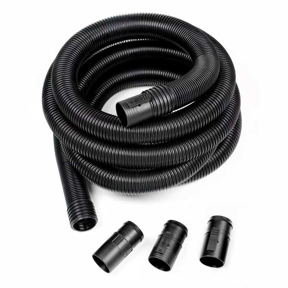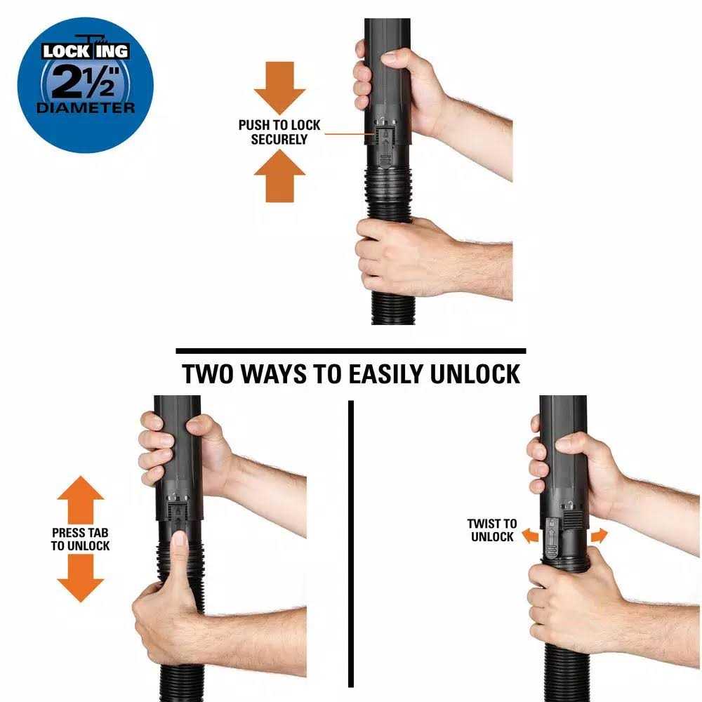 Dual-Flex Tug-A-Long locking hose extends up to 20 ft. for more reach and flexibility than a standard wet/dry vac hose. With the new locking design your hose locks onto both your vac and your wand or accessory so nothing falls during use. It fits all RIDGID 2-1/2 in. inlet configurations and includes 3 adapters for compatibility. The hose’s Dual-Flex feature adds 180 mobility at each end and its flexible design resists clogging. Easily detach by releasing the locking tab or twisting off. The 2-1/2 in. opening is the optimal size for tackling large messes with a RIDGID wet dry vac. Maximum your vac and get the most out of your cleaning tools with RIDGID’s 2-1/2 in. locking accessories. Color Black.
