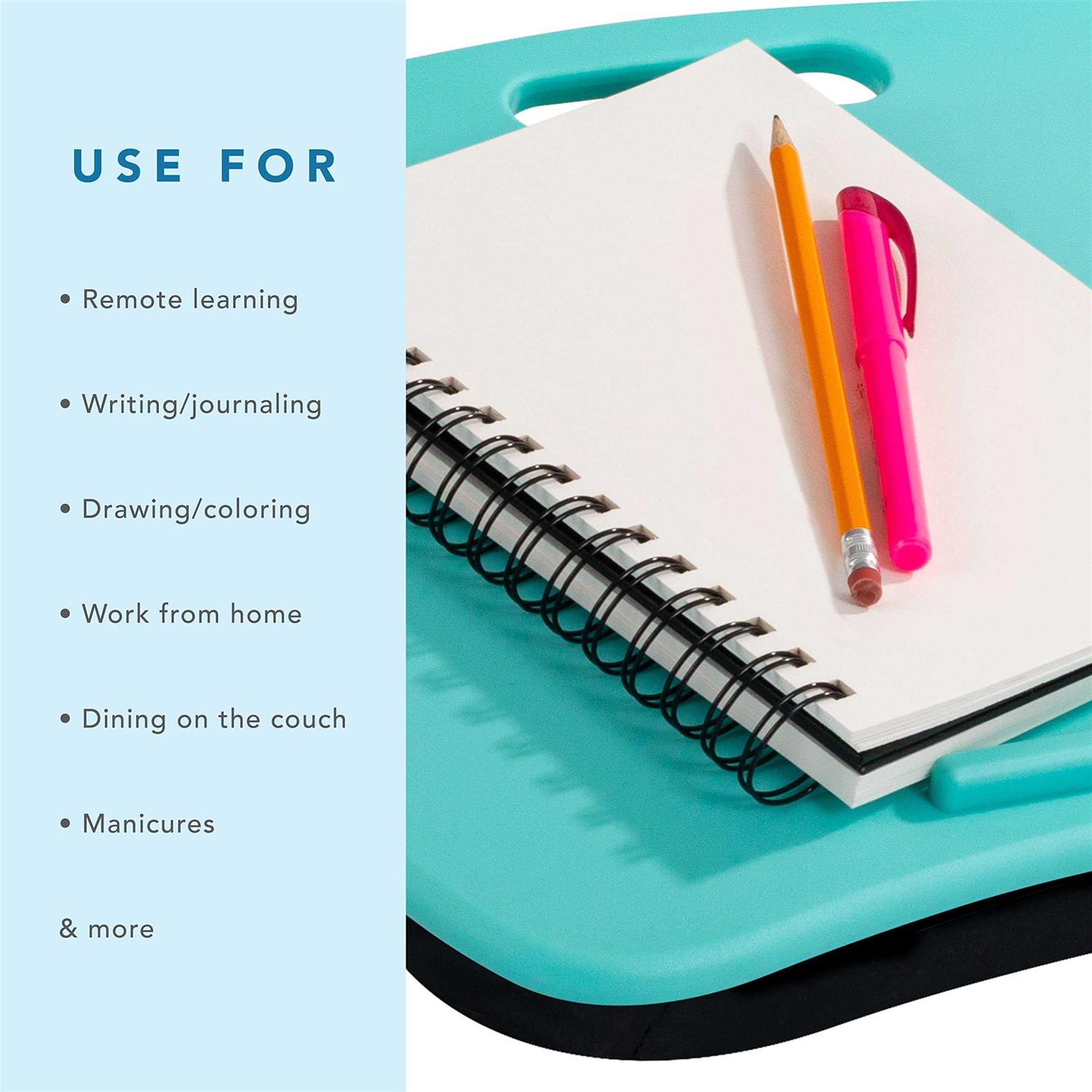 These days, work can be done from anywhere youve got WiFi But that also means you can do fun stuff anywhere. Whether youre collating spreadsheets or indulging in a full-season binge of your favorite show, this Lap Desk is there for you. The 17 inch x 13.2 work surface is made from durable, high-impact polystyrene and accompdates laptops up to 15 inch. Thanks to the reinforced carrying handle and compact size, you can take this desk with you wherever you go. Innovative microbead-filled dual bolster cushions that both create a stable work surface AND channel airflow to reduce heat from the laptop, thus preventing hot legs and overheated computers.