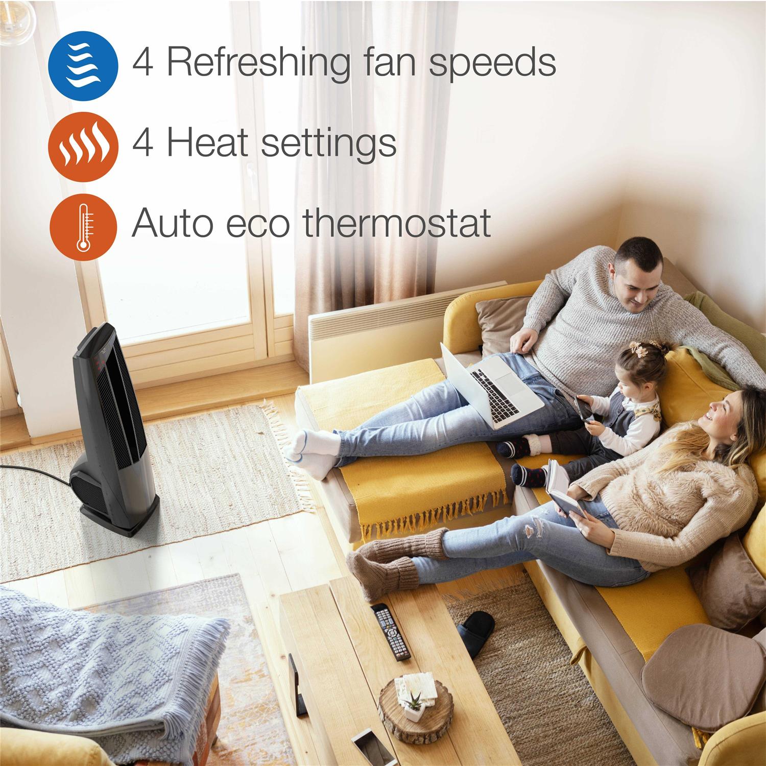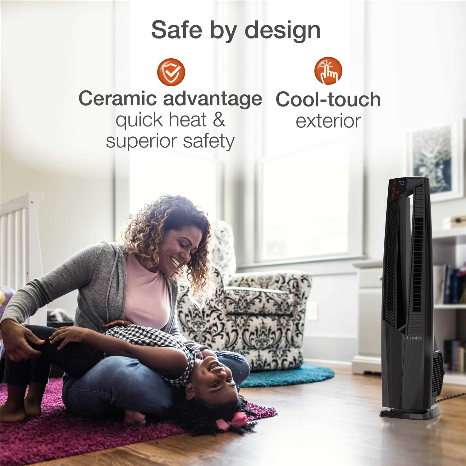 Perfect for homes with different heating and cooling needs throughout the year, this hybrid high velocity fan and space heater from Lasko meets all your home comfort needs. The fan mode features 4 speeds, from low to high velocity. The high velocity feature is perfect for cooling, ventilating, and exhausting your space. The heater mode features 4 speeds from low to turbo heat. Turbo heat projects heat 40% further to quickly warm the room youre in. Additionally, the space heater mode features Lasko’s AutoEco thermostat, which maintains room temperature while using less energy. The widespread oscillation option ensures your warm or cooling air circulates throughout your room. This elegant combo tower fan and space heater also comes with a digital remote control with on-board storage for convenience. The programmable auto-off function allows you to set the unit to run for up to 8 hours. Simple, touch sensing controls make operating this fan/heater a breeze. Plus, it comes with a built-in carry handle for portability. The built-in easy-to-clean filters keep the unit running efficiently. Safety features include Automatic overheat protection and cool-touch housing.