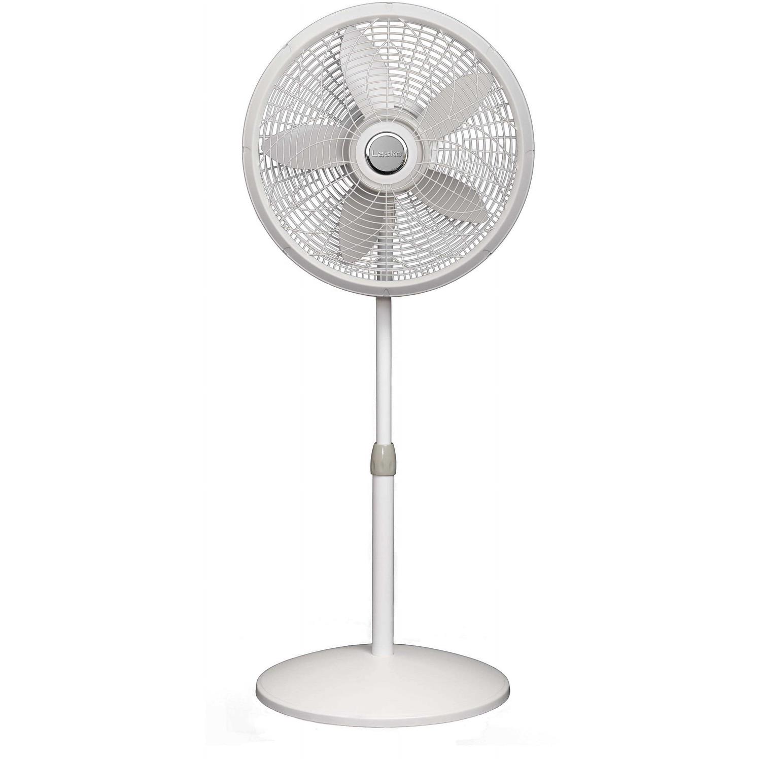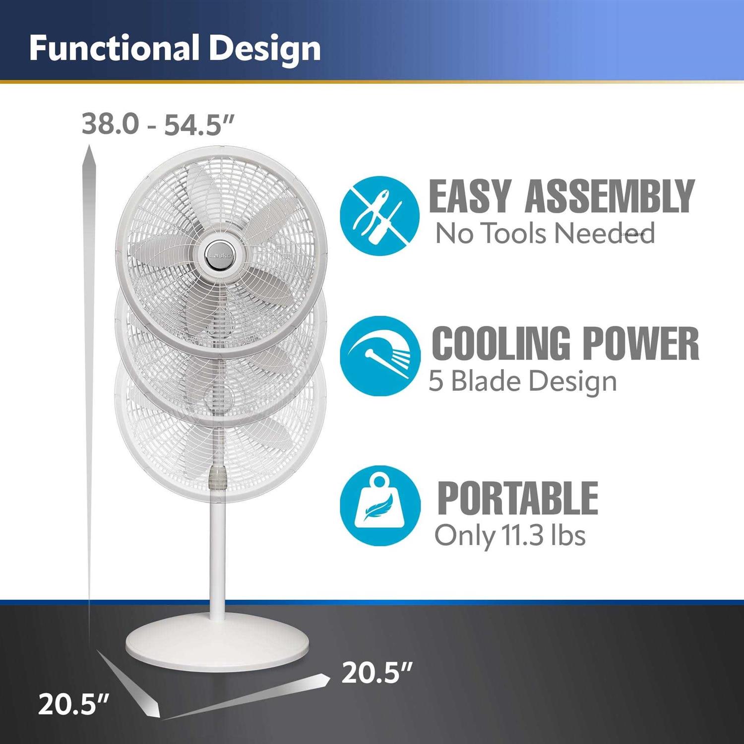Say goodbye to warm dry air and hello to cool air with the Lasko Elegance and Performance 18-Inch Pedestal Fan. Whether you re unloading the furniture into your new home typing away at an office or need a little extra circulation inside a newly constructed home this 3-speed indoor fan has all the cooling power you need to fill up your space and create a more comfortable working or living environment indoors. Our favorite feature of this standing fan is its adjustable base. Whether you need some extra air circulation down low or up high you can adjust this fan from 38 to 54.5 inches in height. In addition to its customizable height this fan also has 3 fan speeds so you can adjust your air movement to exactly how you want it in your room. Luckily this fan is also energy-efficient and quiet so you won t wake the neighbors or butcher your electrical bill either. The 18-inch blade is enclosed with a surrounding guard and the frame is built with durable materials so the structure of the fan won t be damaged by the occasional bump or bruise made by running into or other occurrences found in the home and garage. Built with plastic construction this pedestal fan is built with durability in mind to last you through many cooling sessions. Best of all this indoor fan features an elegant grill design that blends into surrounding decor furniture and other indoor structures. With a stylish white design this 3-speed fan complements any space it is placed in while adding an elegant addition to any area. Work more efficiently and relax more peacefully in overheated spaces with a 3-speed fan that creates a cooler environment. Easy and straightforward this Elegance and Performance 18-Inch Pedestal Fan from Lasko might just be exactly what you need in your room big or small.