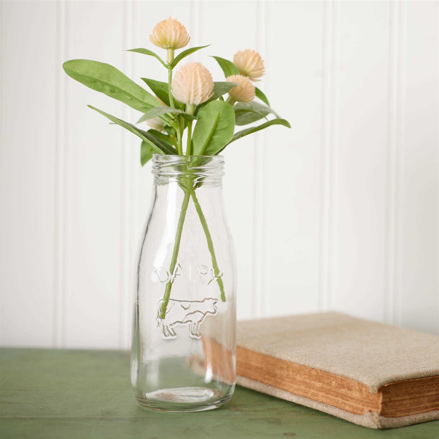 - Clear glass milk bottles with the raised outline of a cow and the word dairy.