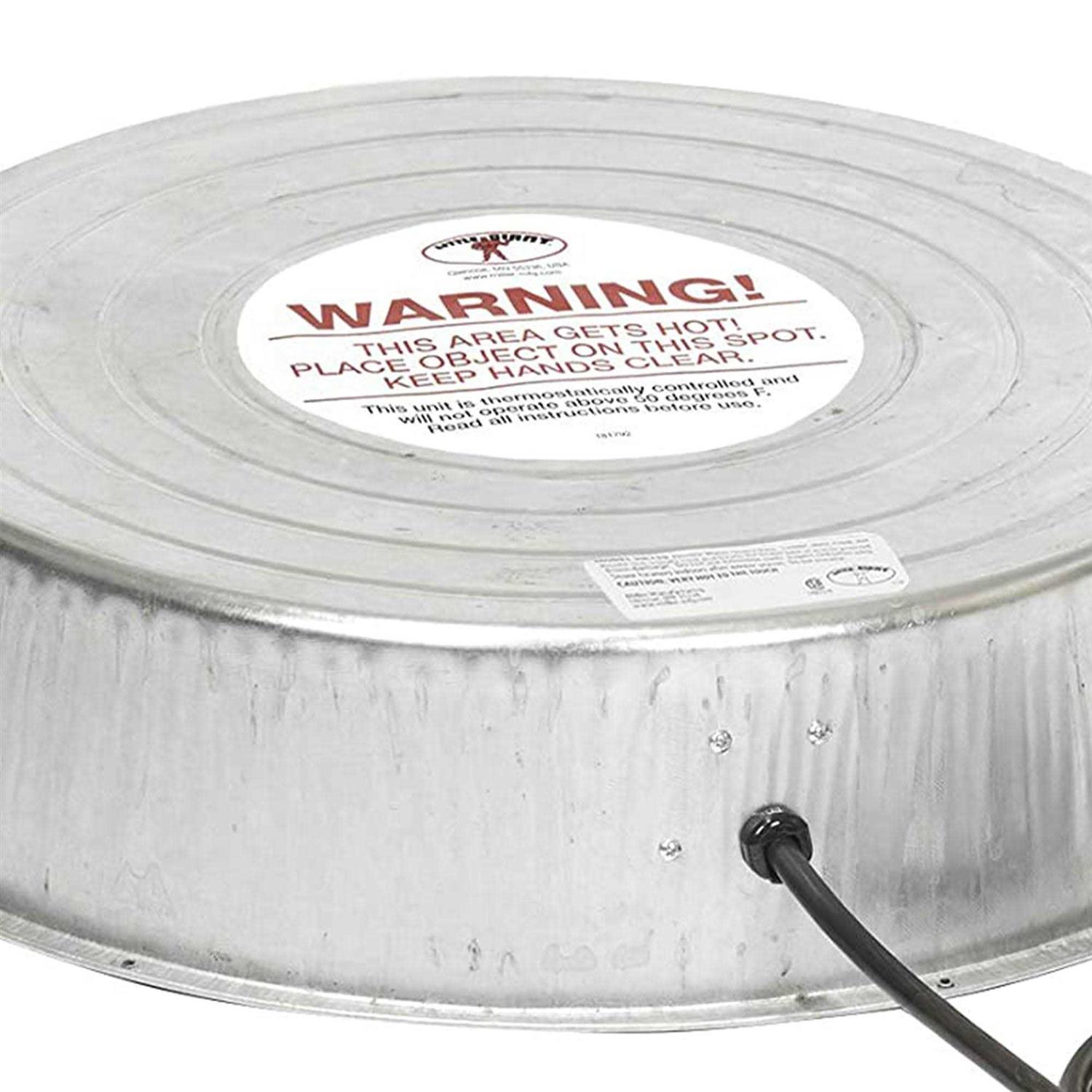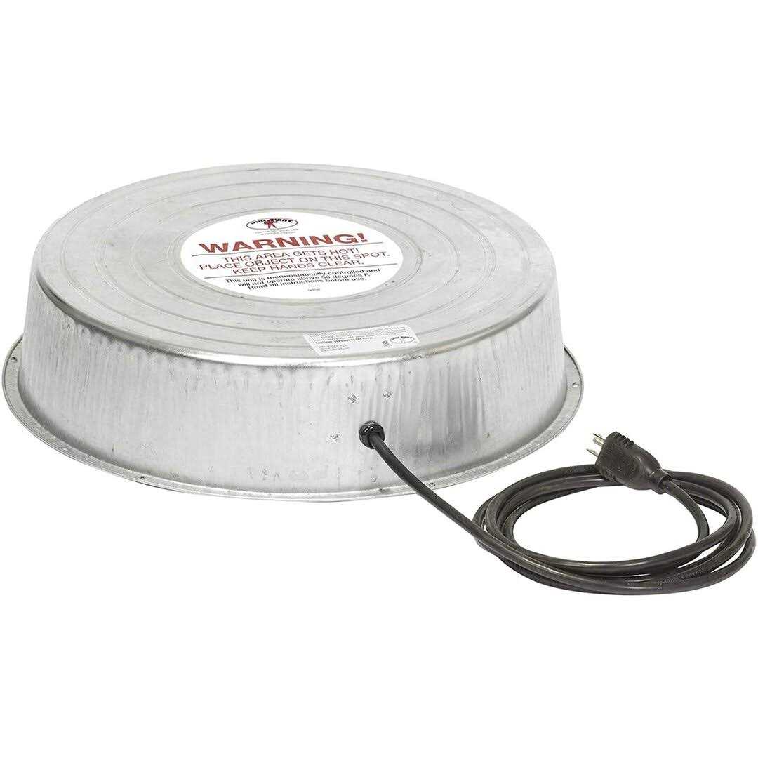 This Electric Heater Base helps prevent water from freezing in temperatures as low as 10 degrees F. Designed for use with Little Giant Double Wall Founts and other all-metal containers. The heating element has been completely redesigned for improved safety and efficiency. The fully enclosed bottom adds another layer of protection. Perfect for unheated coops and barns can be used outdoors in a dry, sheltered area. Made of heavy-duty, rust-resistant galvanized steel. Cord should be protected from animals and used with a Ground Fault Circuit Interrupter (GFCI) protected outlet. Unit will not draw electricity until temperature drops below freezing. Uses less than 1 amp per hour. 16.25 inch diameter by 3.687 inch high.