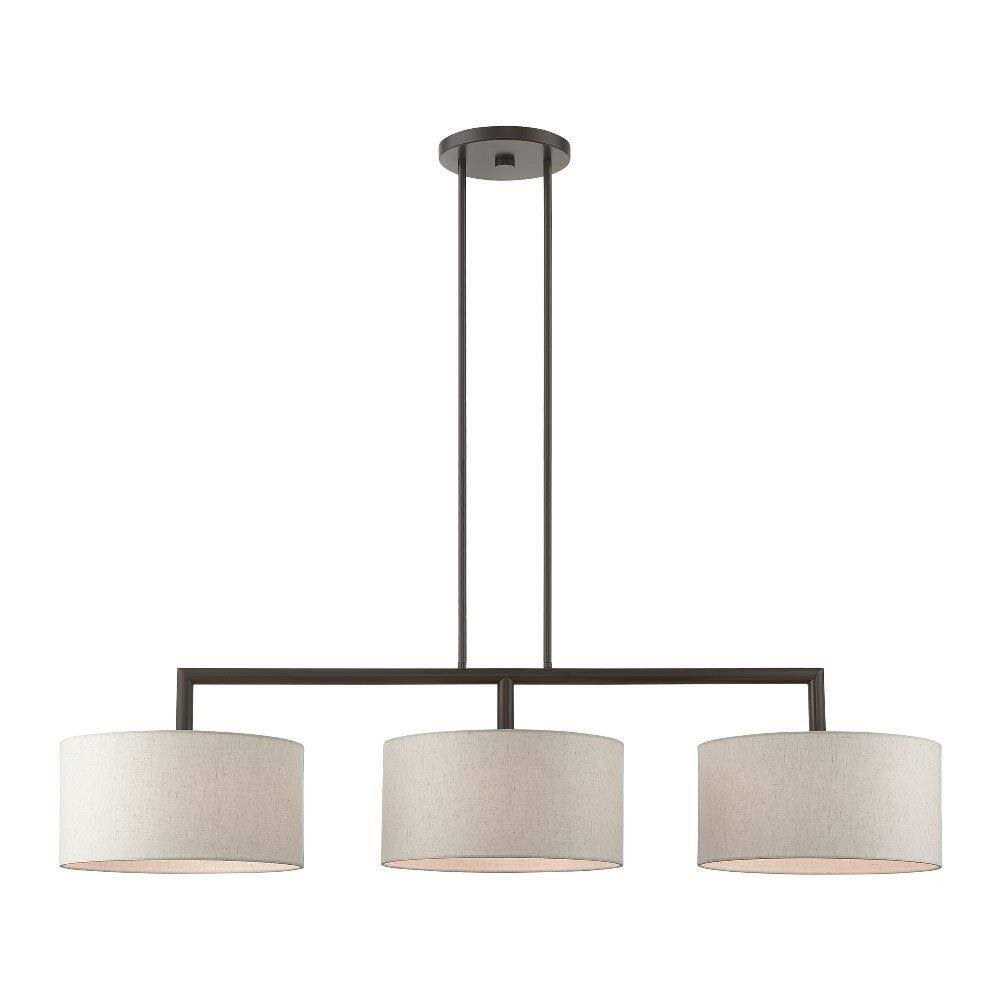 Livex Lighting is well known for quality style and value. The Meridian collection has a clean crisp look and contemporary appeal. The hand-crafted oatmeal colored fabric hardback shades offer a diffused warm light. This 3-light linear chandelier has a sleek upper frame over the 3 shades. Will adapt well in the living room dining room and over the kitchen island tastefully elevating your style. This sleek design is shown in a brushed nickel finish. This well-rounded fixture is sure to satisfy your lighting needs.