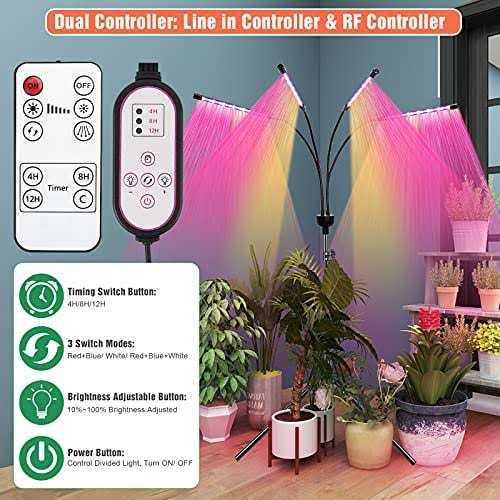 Quality Grow Light with Stand: stable, durable tripod stand, can be adjusted from 15” to 60”, with 360 degree flexible gooseneck, compared with clip grow light and hanging grow light, our stand one is flexible to adjust and setup according to your different needs, provide a much wider coverage for indoor plants Comprehensive and Effective Spectrum: this 4-head grow light contains 3 supplemental light modes:1. warm white(3000k), similar to sunlight, simulate nature environment for plants; 2. Red(660nm)+Blue(460nm): promote photosynthesis, rooting, germination, blooming, fruiting; 3. Red+Blue+White(380nm-780nm), provide universal full spectrum which can meet different needs of all plant growth Double Control and Auto On/Off Timer Function: equipped with line-in controller and RF controller, remote control is more convenient to operate and protect your eyes. Designed with auto circular memory timing function, 4/8/12H modes for you to choose, the plant light will turn it on by itself everyday as your setting, solve the problem of usage when nobody at home 10 Level Brightness and Perfect Heat Dissipation: our plant grow light has 10 brightness setting ranging from 10% to 100%, you can randomly switch it to find the most suitable brightness for your plant growth, helps your plants grow 5 times faster and more flourish than natural; Scientific heat dissipation system equipped as well, will protect grow lamp bulbs not very hot as traditional one, reduce light loss and extend life to more than 50000 hours Widely applications: our plant grow light with stand are mainly designed for indoor plants, suitable for balconies,greenhouses,darkroom,office and so on, especially when the plant needs extra light when raining,snowing,dark indoor,etc.