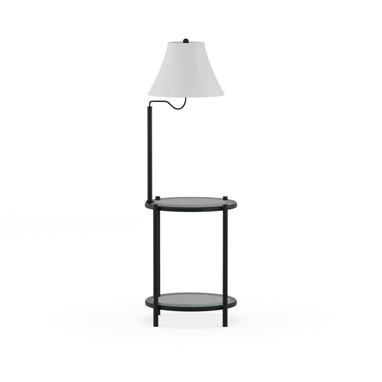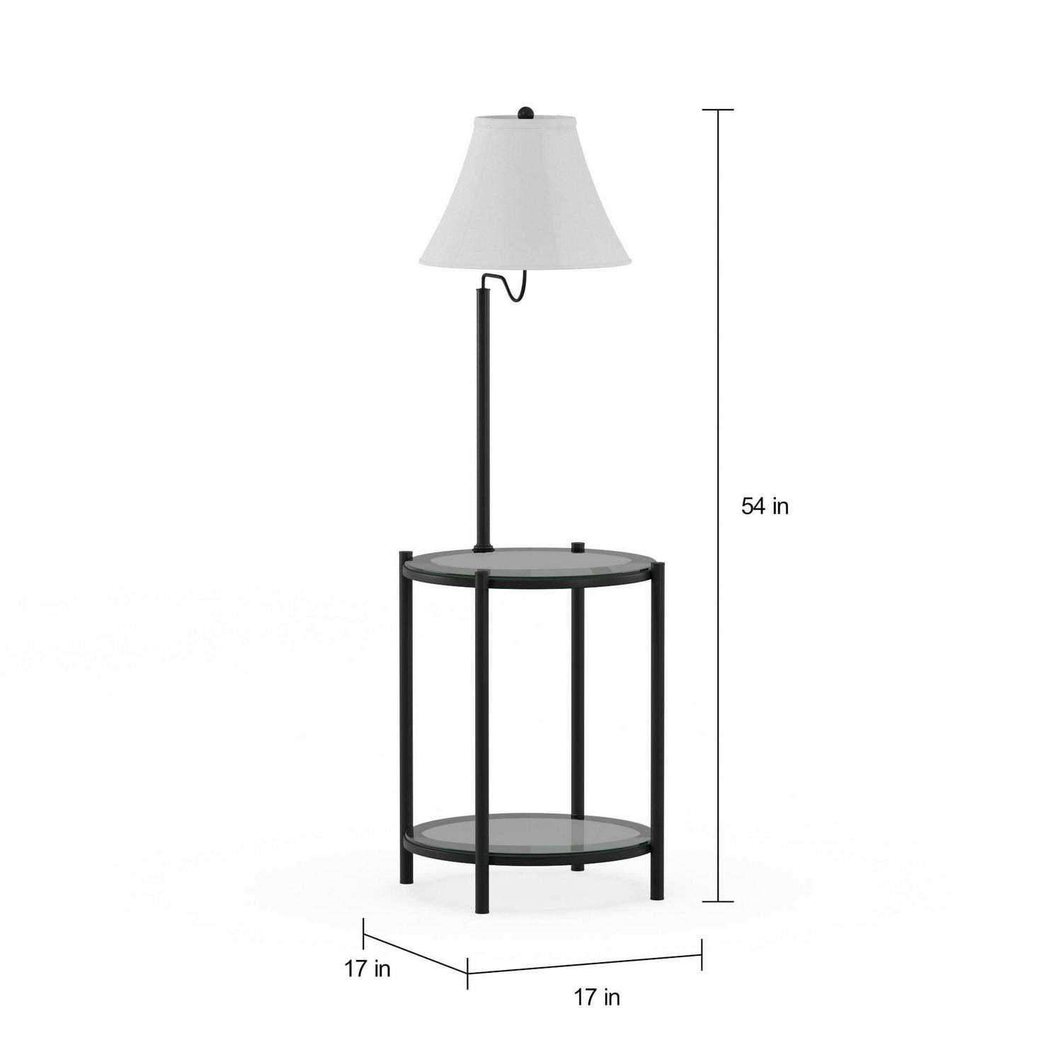 The Mainstays Glass End Table Floor Lamp is a smart addition to a living area. This multi-purpose combo offers a functional purpose with a stylish bell lamp shade and a black matte finish frame. You can keep your living and relaxation essentials at your fingertips. It features a sturdy metal structure with bottom shelving to store magazines books and collectibles. A 22 inch round glass tabletop serves as the optimal space for your morning coffee or evening cocktail. The table with lamp stands at 53.5 inch tall and has a swing-arm light to optimize your reading experience. This space-saver is an ideal solution for rooms that are short on space Place it next to your favorite chair or sofa. It also doubles as a nightstand in a bedroom. This 2-in-1 Mainstays side table lamp is easy to assemble and maintain. Its sure to add a tasteful touch to your space.
