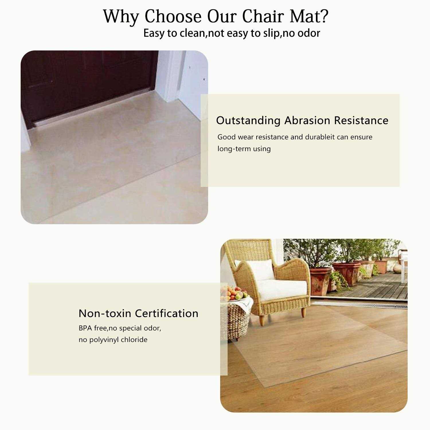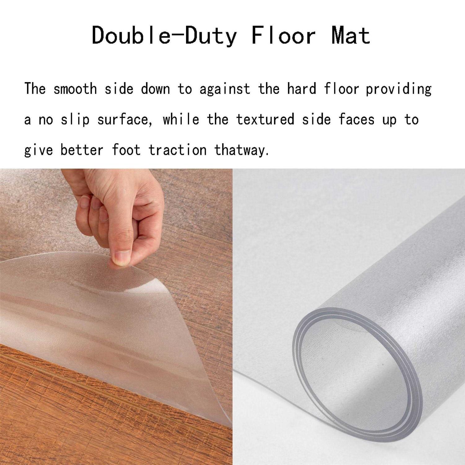 PVC OFFICE CHAIR MAT NOT FOR CARPET:Suitable for hardwood floor:vinyl, hardwood, laminate, stone, tile and concrete. Not recommended for carpet. You can use it in the office, at home and so on. It’s very convenient. Anti-slip:Frosting on the surface can achieve a strong grip which prevent the chair from slipping while controlling the roll of the chair which also helps to considerably reduce the risk of leg fatigue. DURABILITY:The floor mat is stronger and more durable.You don’t have to worry about bending when you use it, or accidentally breaking it and causing scratches.It’s designed to provide high impact resistance. HEALTHY MATERIAL:Made of PVC and free of the BPA. It contains no volatile toxin, no special odor, for a healthy indoor environment.Even if your child is lying on the chair mat, you can rest assured. PROTECTIVE FLOOR:Help to protect your floor from scratches and damage caused by office chair casters and protect your floor. It’s made to be convenient for persons who constantly move around in their office chair.