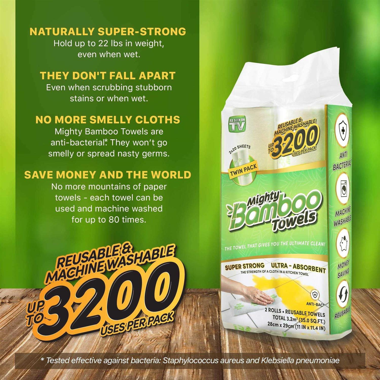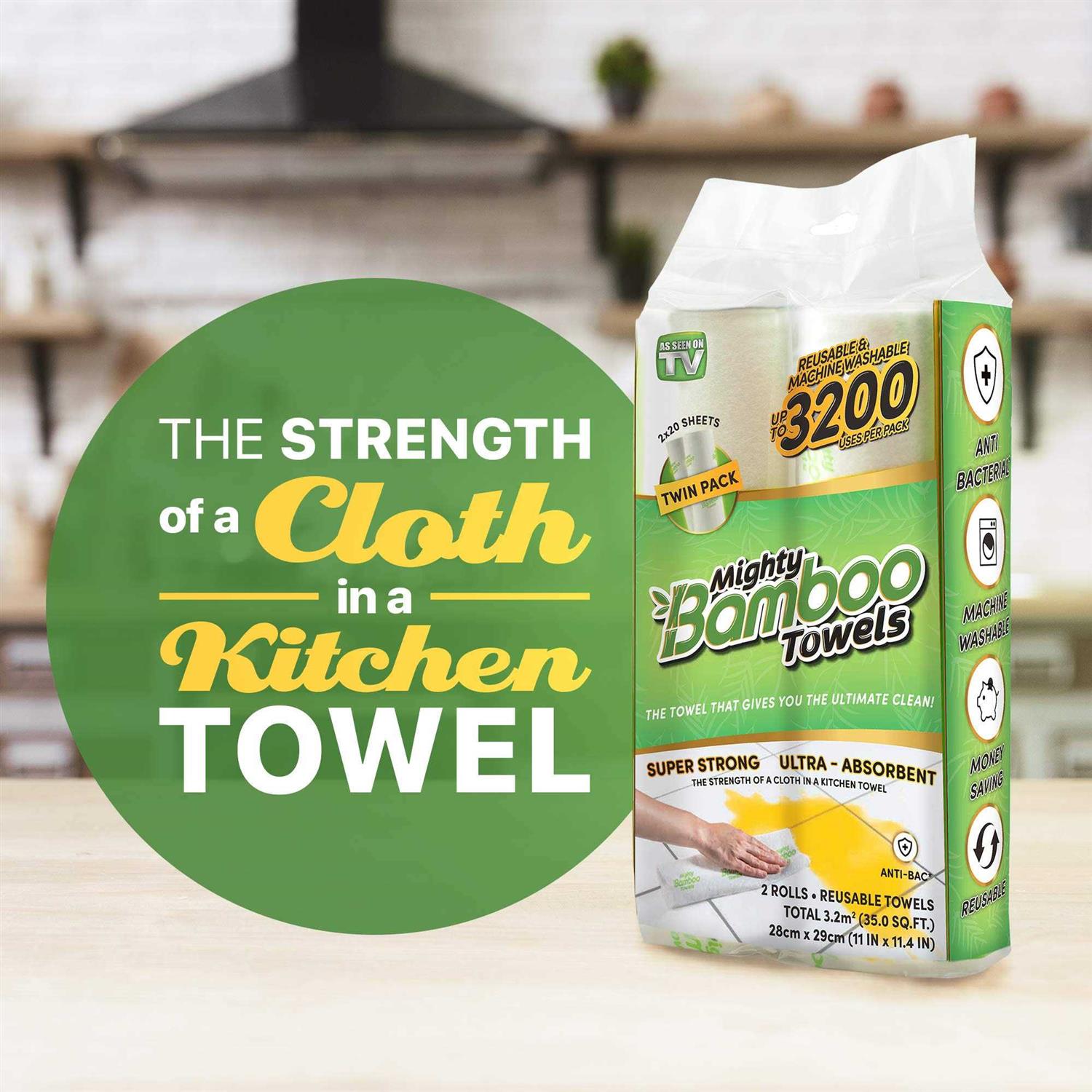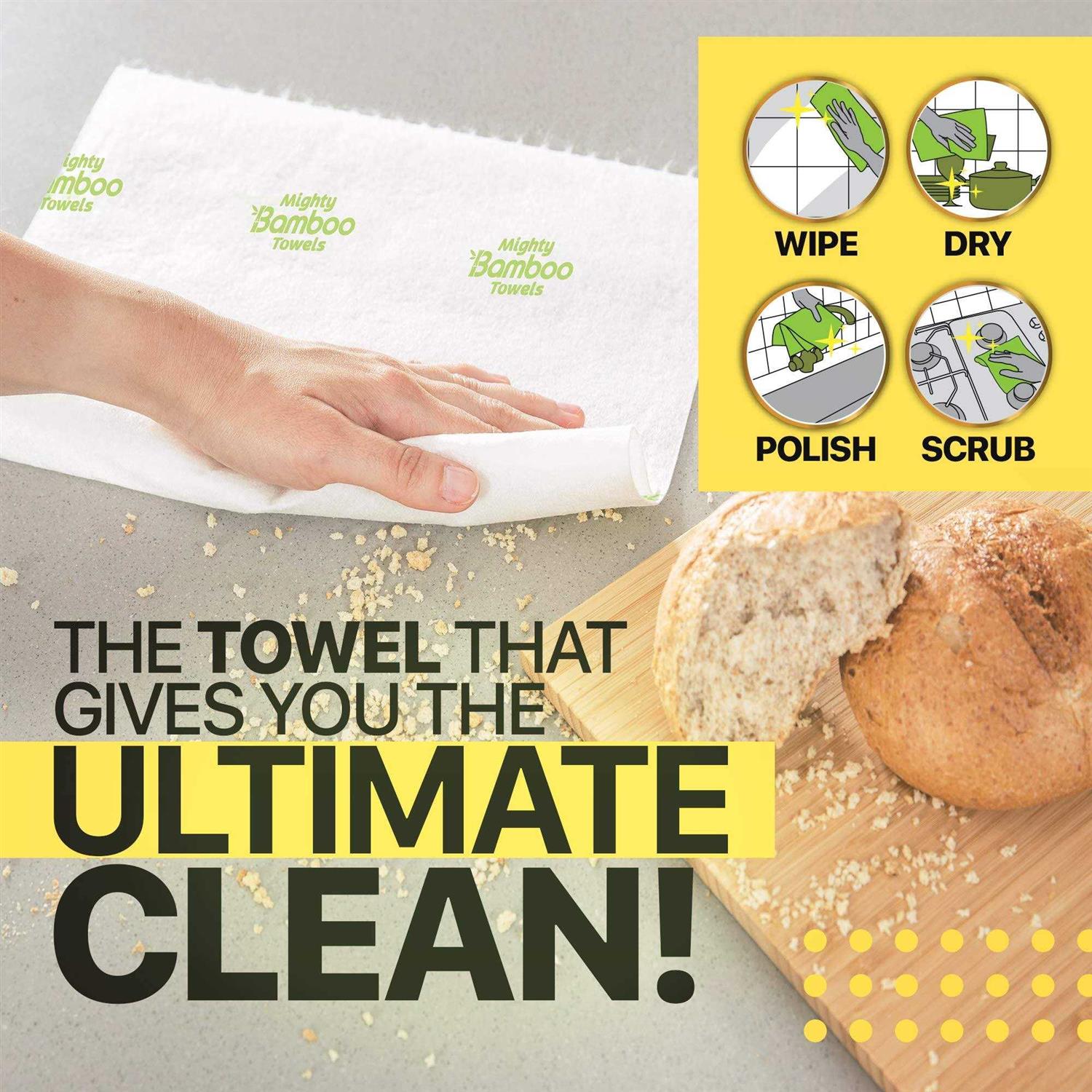The strength of a cloth in a kitchen towel. The towel that gives you the ultimate clean. Supestrong and ultra absorbent. Reusable and machine washable with up to 3200 uses per pack. Naturally super strong and holds up to 22 pounds in weight, even when wet. No more mountains of paper towels, each towel can be used, and machine washed up to 80 times.