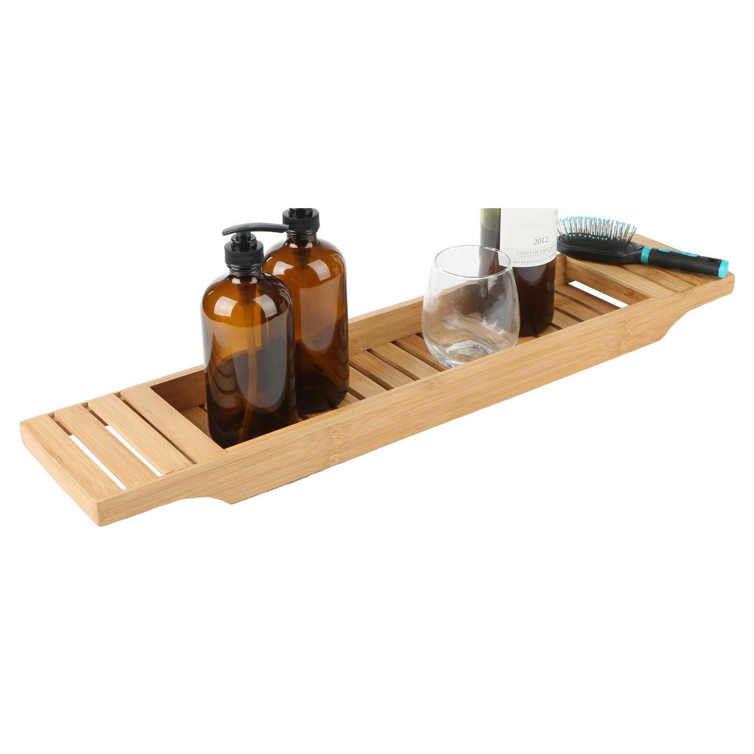 Comfortable and Durable Bath Caddy Use this bath caddy to relax after a long day. It requires no assembly and is ready for use out of the box. It fits most standard bathtubs, simply rest the tray on the edges of your tub. It can be used in the shower, too, as a shelf for your body washes, shaving gels, and loofah storage. With a weight of only 1.29 lbs (0.6 kg) the caddy is very lightweight and can be used outside the bath or shower. It is moisture-resistant and warp-resistant. Use the caddy for a relaxing bath and keep items such as bath salts, a candle, a beverage, and your phone within easy reach. Be careful with electronics near water as most are not waterproof. With this set of two you can keep one for yourself and give as a gift! This caddy makes a great gift for the holidays, birthdays, and housewarming parties.