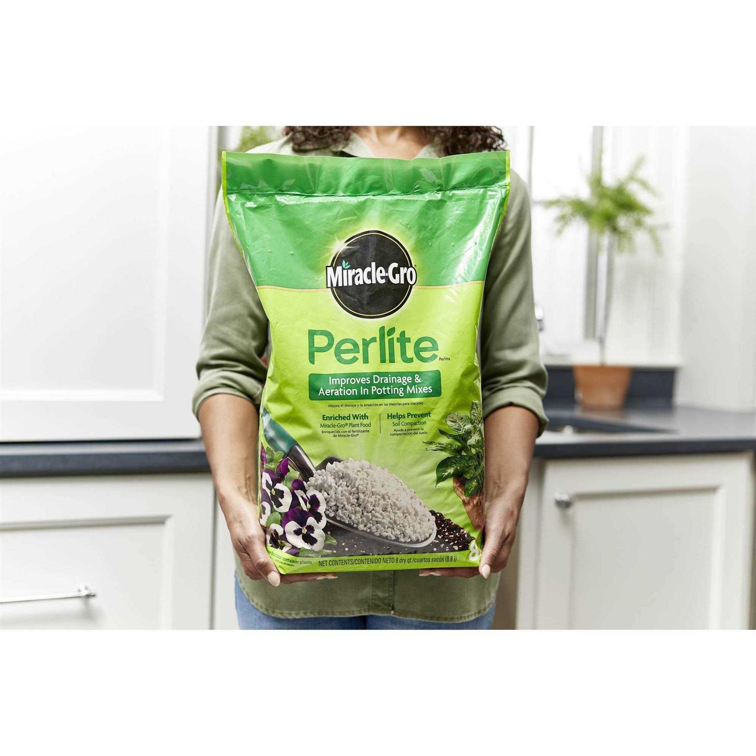 Miracle-Gro Perlite improves drainage and aeration in potting mixes. Use in containers to help prevent soil compaction and promote strong root development. Excellent for starting cuttings and storing bulbs. Helps prevent soil compaction in containers and promote strong root development. Enriched with Miracle-Gro Plant Food for beautiful plants. Size: 8 quart Use in containers to help prevent soil compaction and promote strong root development Enriched with Miracle-Gro Plant Food for beautiful plants Excellent for starting cuttings and storing bulbs Improves drainage and aeration in potting mixes. How to Use For Rooting Cuttings Fill Container with Miracle-Gro perlite Water thoroughly Make holes with a pencil Insert cuttings, pressing Perlite around them Keep moist and out of direct sunlight For Storing Bulbs and Root Crops pour dry Miracle-Gro Perlite around bulbs. Do not pack down or water when storing. For best results, dip cutting in rooting compound according to rooting compound directions. After roots have formed, transplant cuttings into Miracle-Gro Potting Mix. When to Apply This product can be applied anytime. Where to Use For use in container plants only. Benefits Improves drainage and aeration in potting mixes. Excellent for starting cuttings and storing bulbs. Helps prevent soil compaction in containers and promote strong root development. Contains Miracle-Gro Plant Food. Fertilizer Analysis 0.07 – 0.07 – 0.07 Packaging Bag.