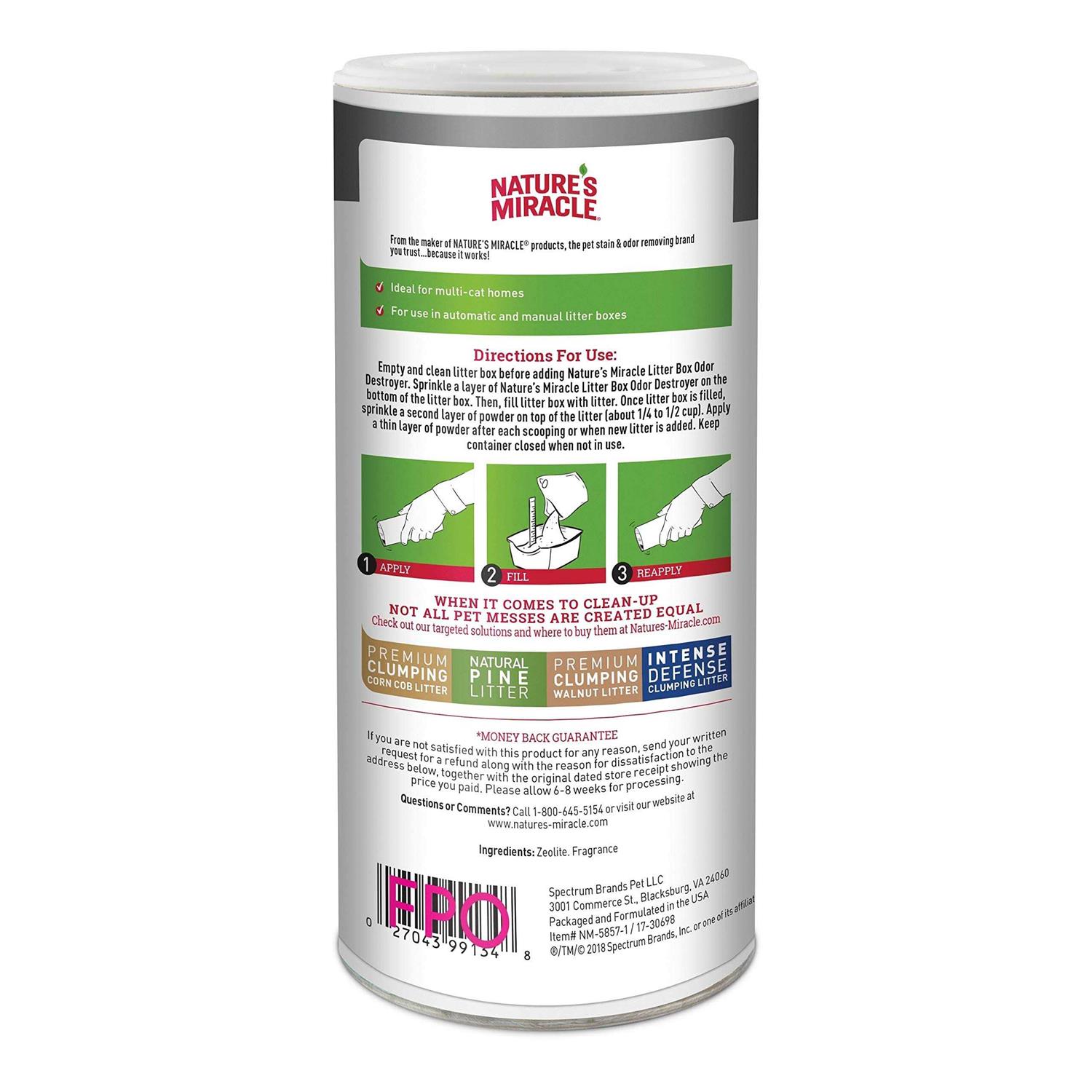 Natures Miracle pet stain and odor removers have been a trusted brand for pet mess cleanup for more than 30 years. With the expansion to training aids, cat litter, disinfectants and other products, Natures Miracle brand can be trusted to provide innovative solutions to a range of pet problems. Natures Miracle Just for Cats Litter Box Odor Destroyer Powder removes your cats strong waste and urine odors and draws away fluids to help prolong litter life. It is ideal for multi-cat and large cat homes. Natures Miracle Just for Cats Litter Box Odor Destroyer Powder helps keep your cats litter boxes clean. It is designed to be used with all litter types and can be added to both manual and automatic litter boxes. This product is safe for your pets and home, when used as directed. Trust the miracle when finding solutions for a clean home and a happy, healthy pet.